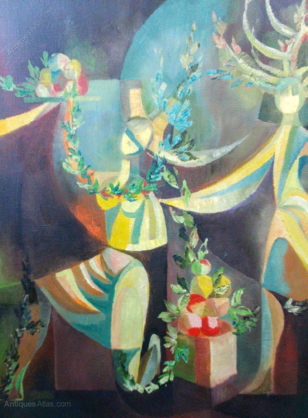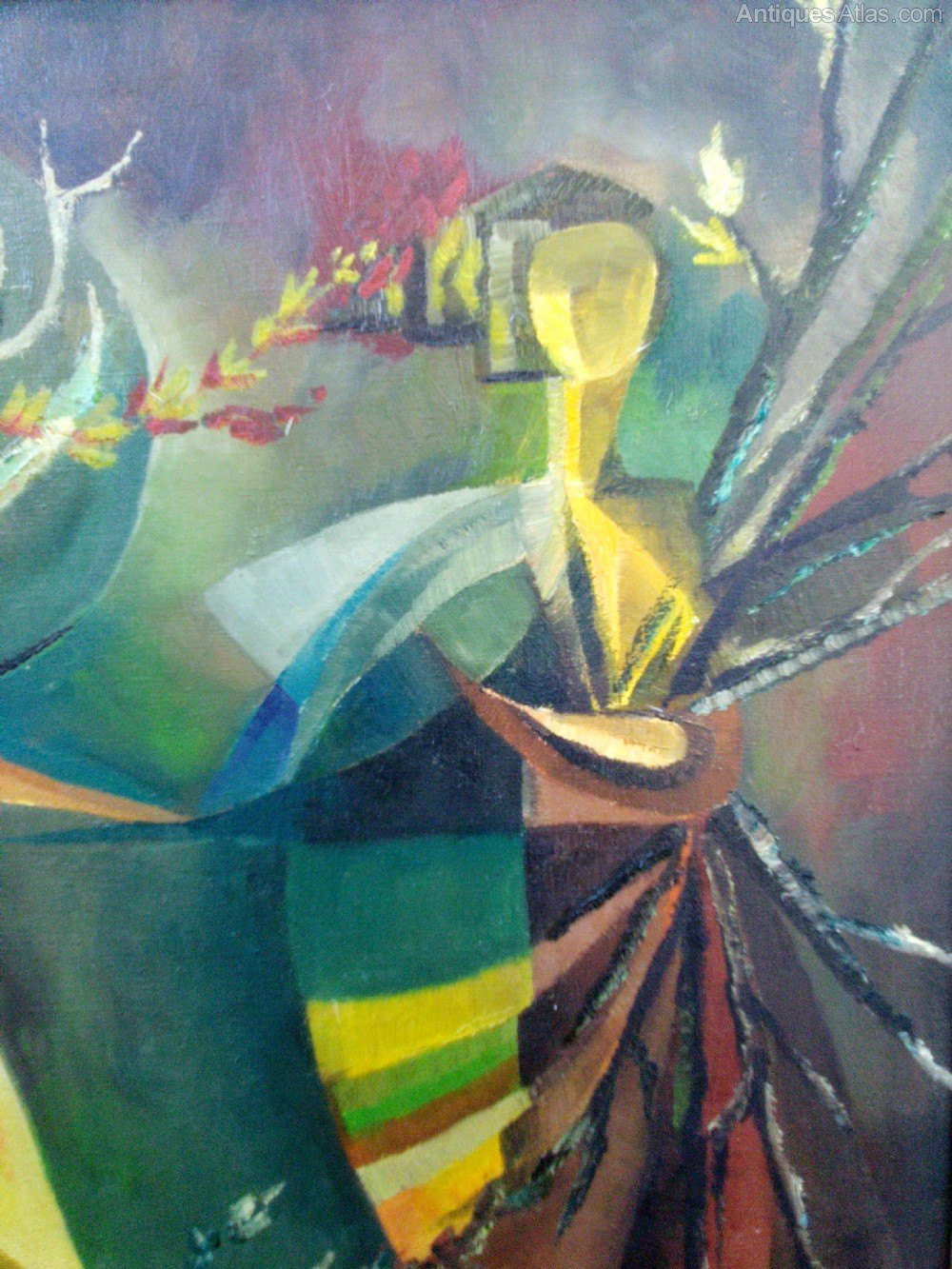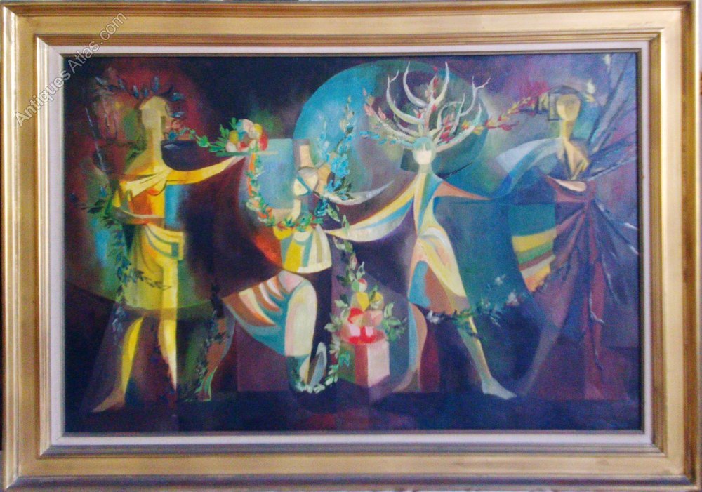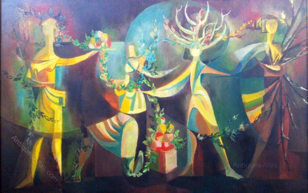A large, bold and beautiful surrealist composition depicting the Four Seasons, somewhat reminiscent of the work of Lucien Coutaud (1904-1977). There are several annotations on the stretcher bars, and the previous owner had attributed the work to Franco-Spanish artist Juana Faure, but I am not sure this is conclusive. To my mind, it is certainly the work of an artist who did theatre decors or murals.