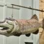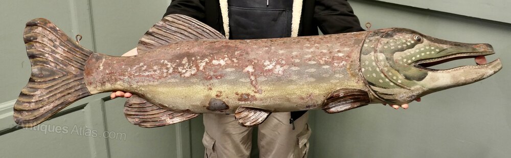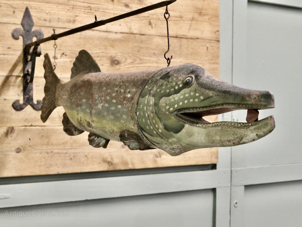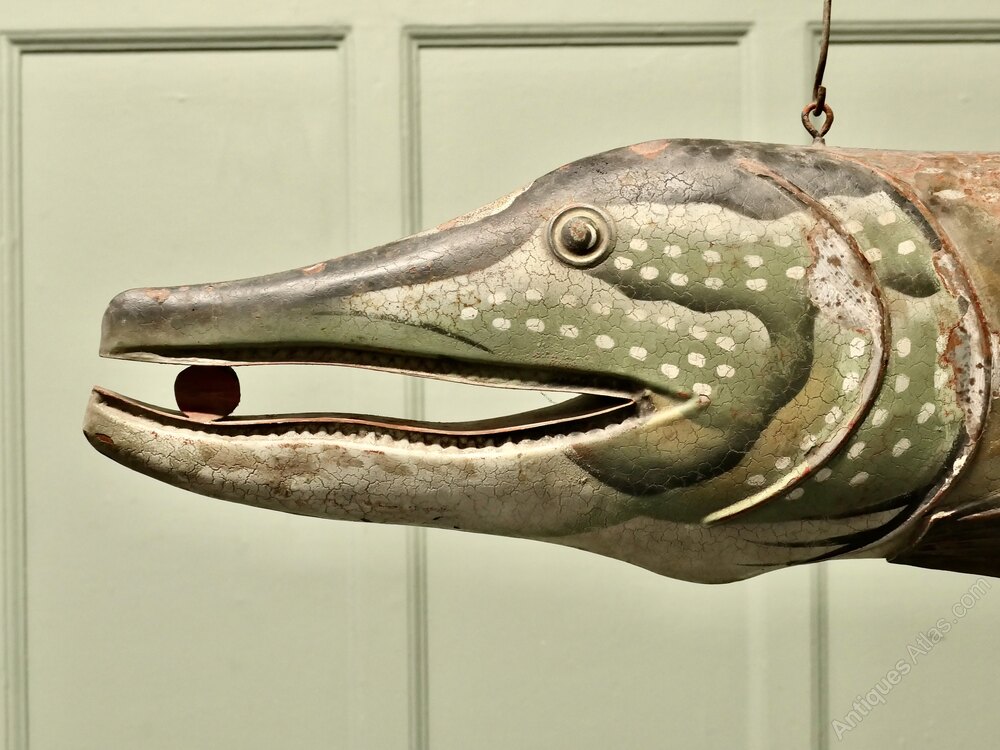 The Pike hangs swimming out from the wall, still sound condition with a bit of weathering to the paint, a very rare piece and well worth adding to any collection or it would be authentic shop decoration, especially where caviar might be found