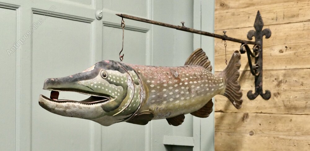 The sign is composed with a painted metal fish or Pike (fins and all) which hangs from a wrought iron bracket