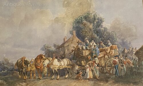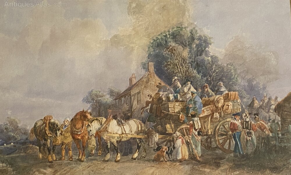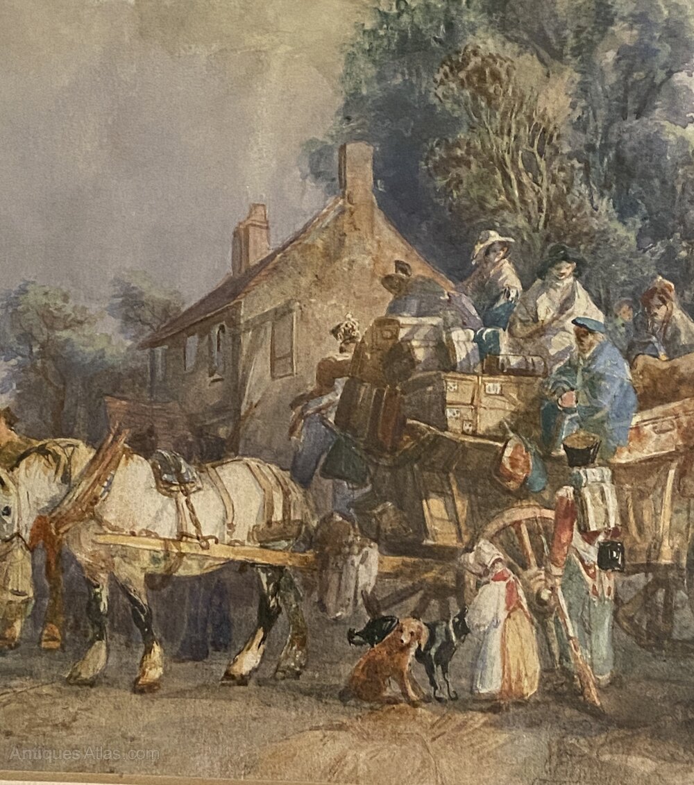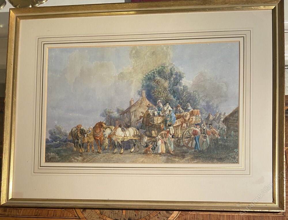 Old Watercolour Of Arrivals At A Country Inn