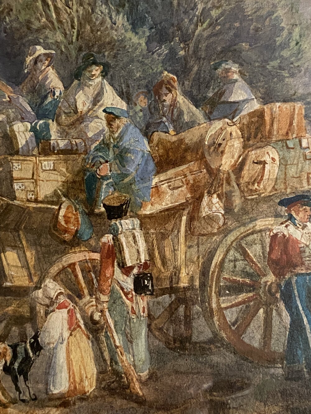 An old watercolour depicting a group of travellers arriving at a country inn the 19th century.With numerous figures ,horses.