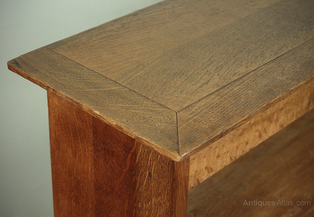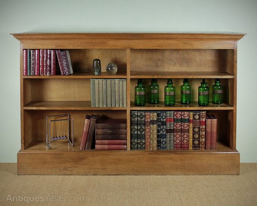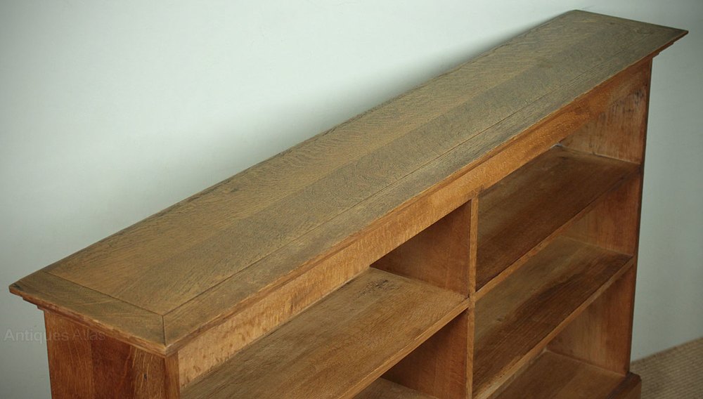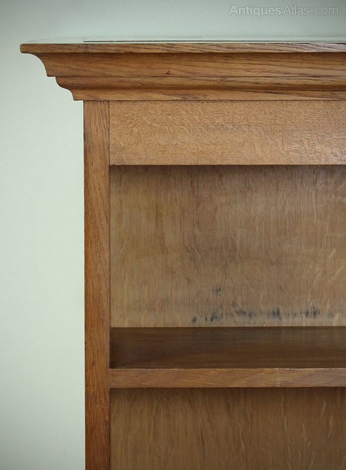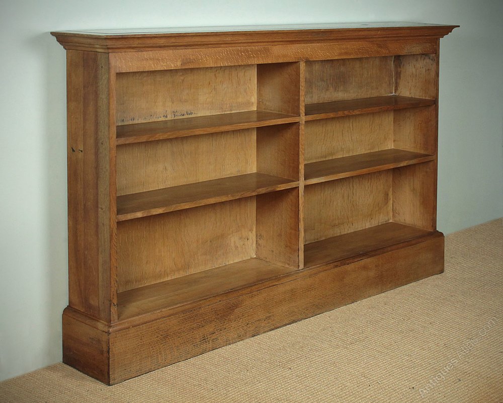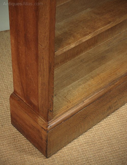 Superb quality open oak bookcase c.1910 reputedly from Repton School in Derbyshire. Simple uncluttered design in pale English oak very much in the manner of Heals. Flared cornice over fixed shelves of 9” depth (8¼”, 9”, 12½” available height) and a tall plinth with moulded trim. Solid oak throughout. A couple of small ink stains to one side, otherwise excellent colour and condition.