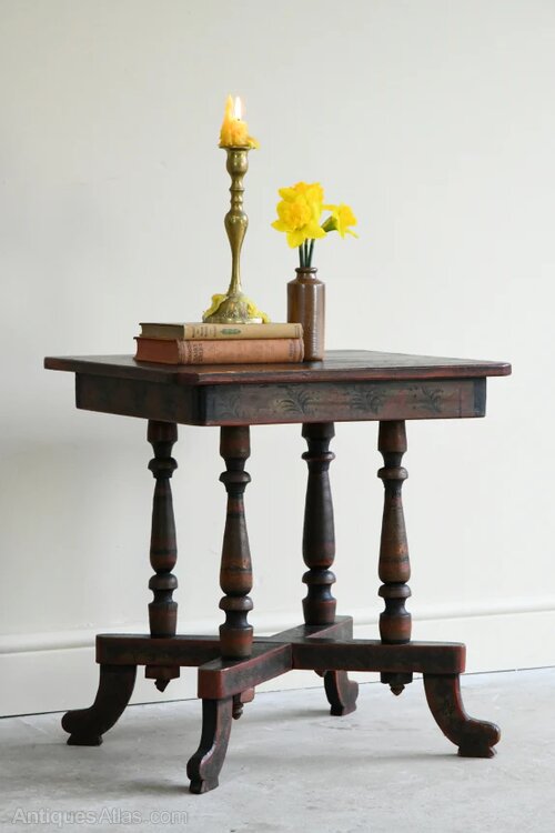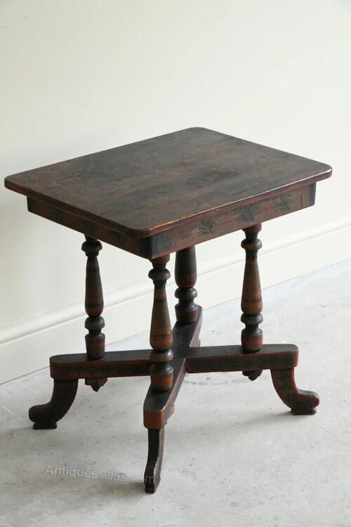 Oriental Style Side Table. Early 20th Century small antique table with a rectangular top, black and red stained finish with handpainted floral decoartion to the frieze, on 4 turned supports and small scrolled feet. A practical little occasional table, suitable for use as a lamp or side table.