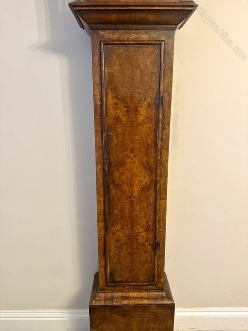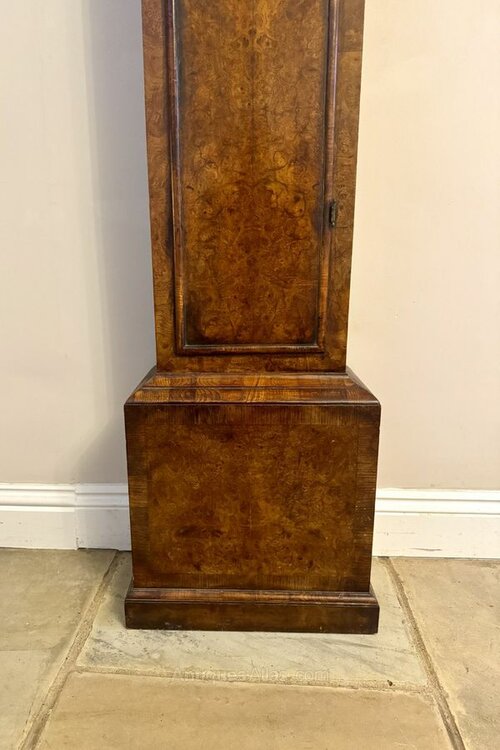 Having a quality burr walnut case housing the original pendulum and weights above a plinth shaped base.
