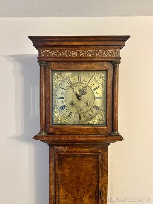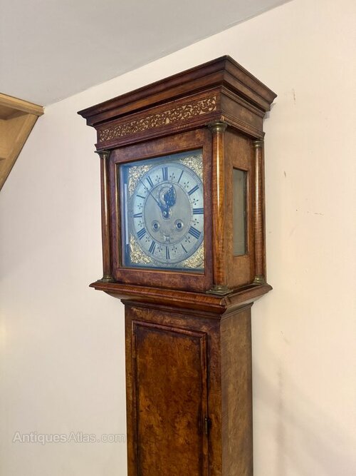 Outstanding quality original Henry Massy burr walnut longcase clock, having a original Henry Massy quality longcase clock, with a quality burr walnut polished case with a rectangular shaped hood, an overhanging cornice above a decorative carved border above a glazed door flanked by walnut columns casing a superb quality square ornate brass face with a circular dial to the centre having black Roman numerals and ornate black hands signed to the dial Henry Massy, with a eight day movement striking on a bell.