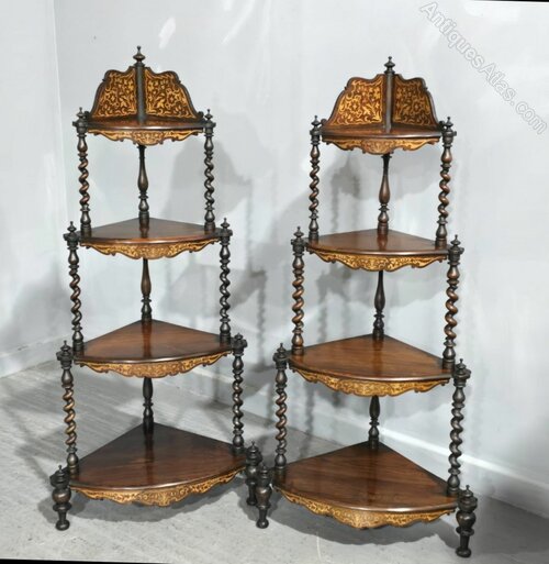 Superb pair Victorian rosewood corner stands, excellent quality inlays, tight twisted supports, in excellent overall condition.