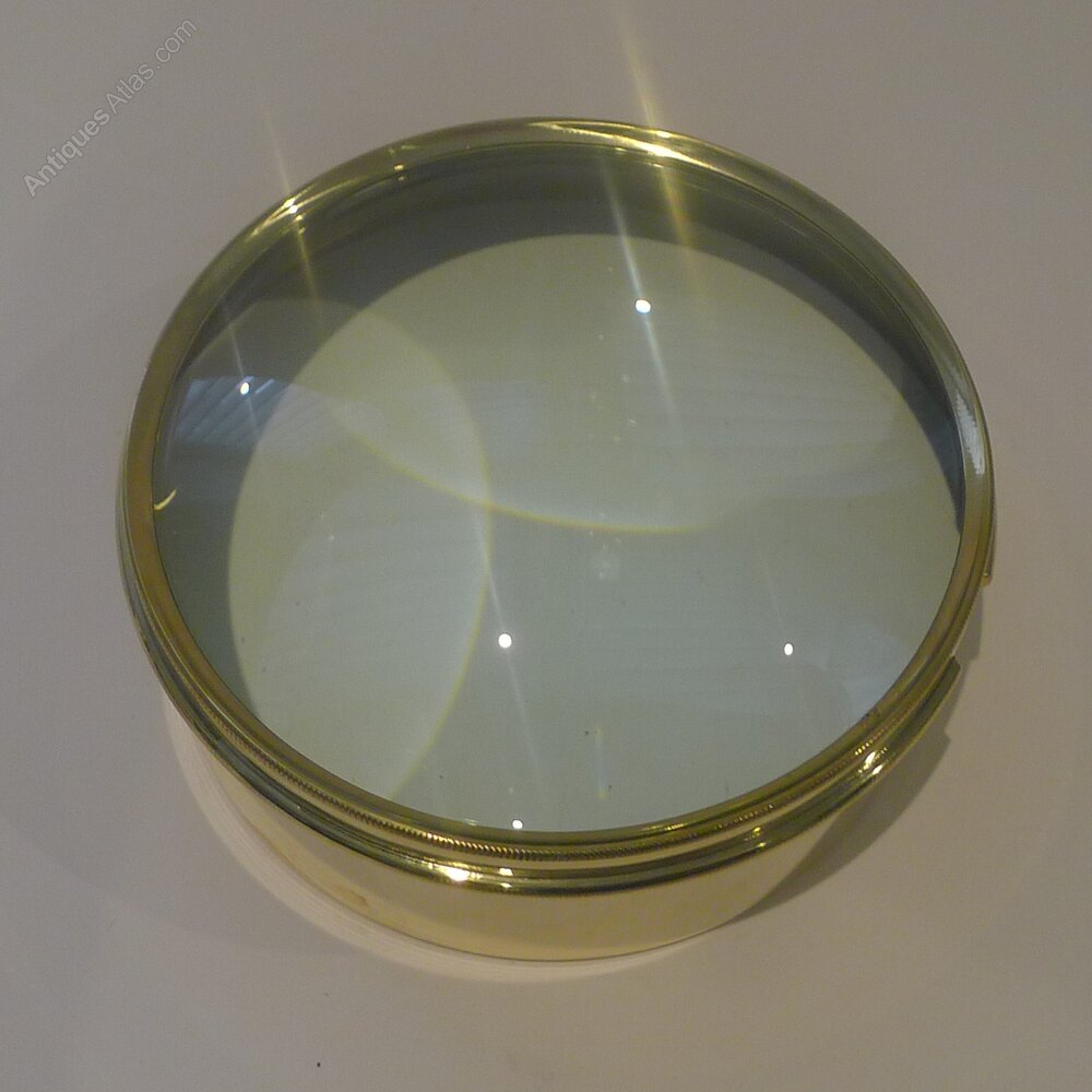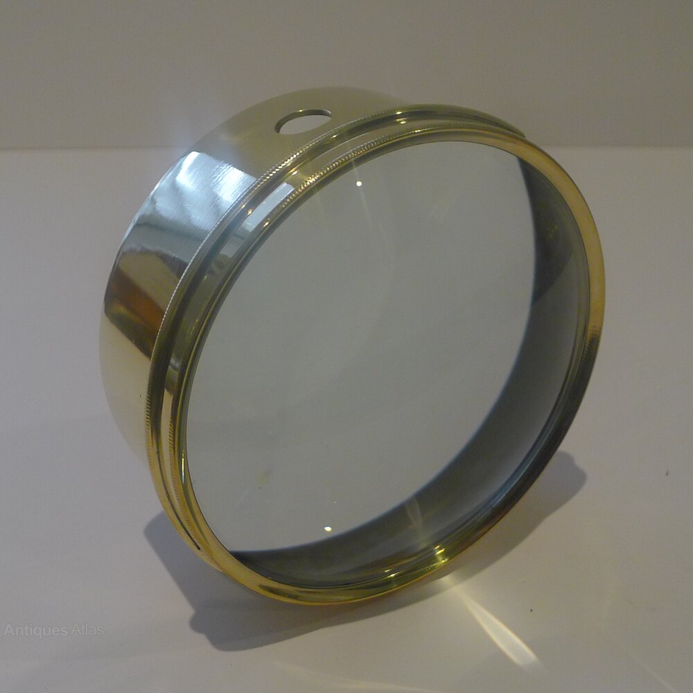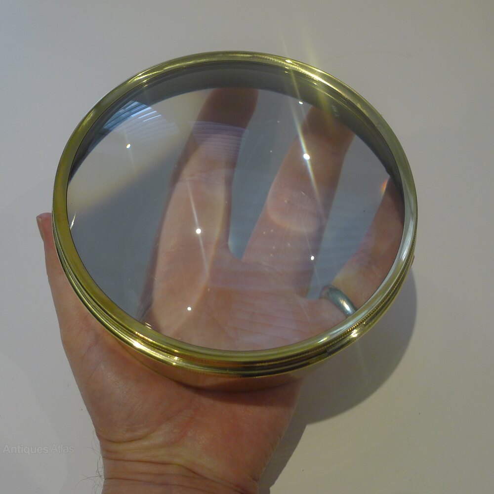 Always very popular and a very useful desk-top accessory, this one is larger than the average size, quite an imposing size. These large circular magnifiers actually are the condenser or magnifier from a Magic Lantern dating to around 1910 they are rescued, polished up and put back to use in the modern day.