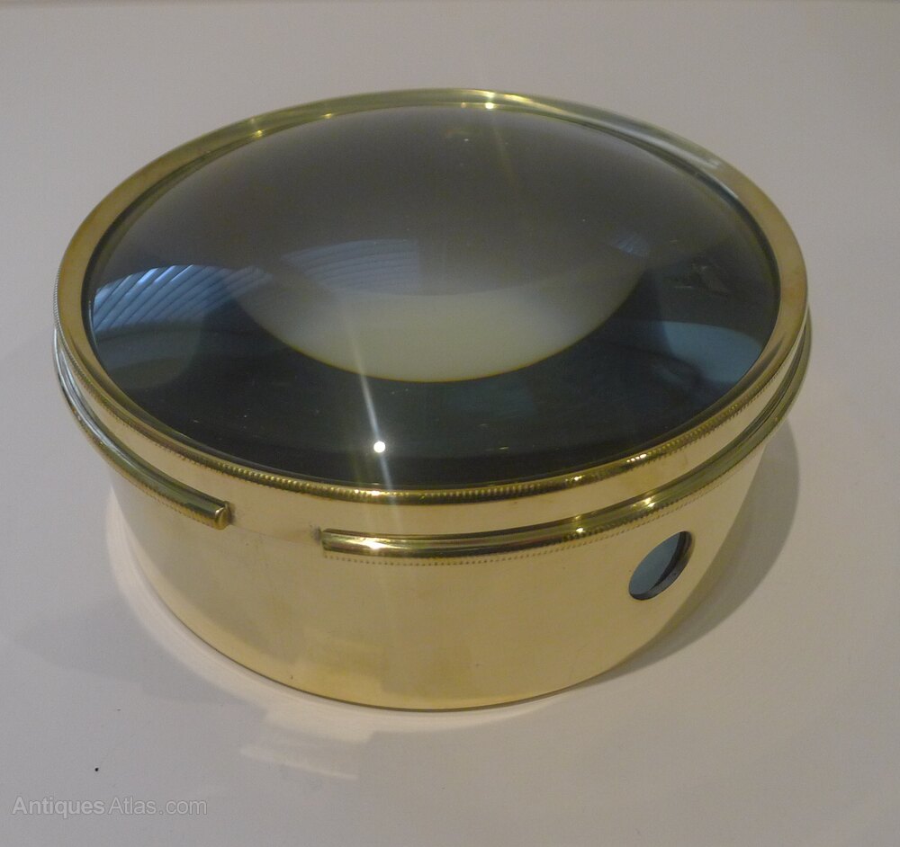 This one is made from polished brass and is excellent quality, un-marked but probably by Optimus. The top of the glass is domed, always more sought-after than the flat lenses.
