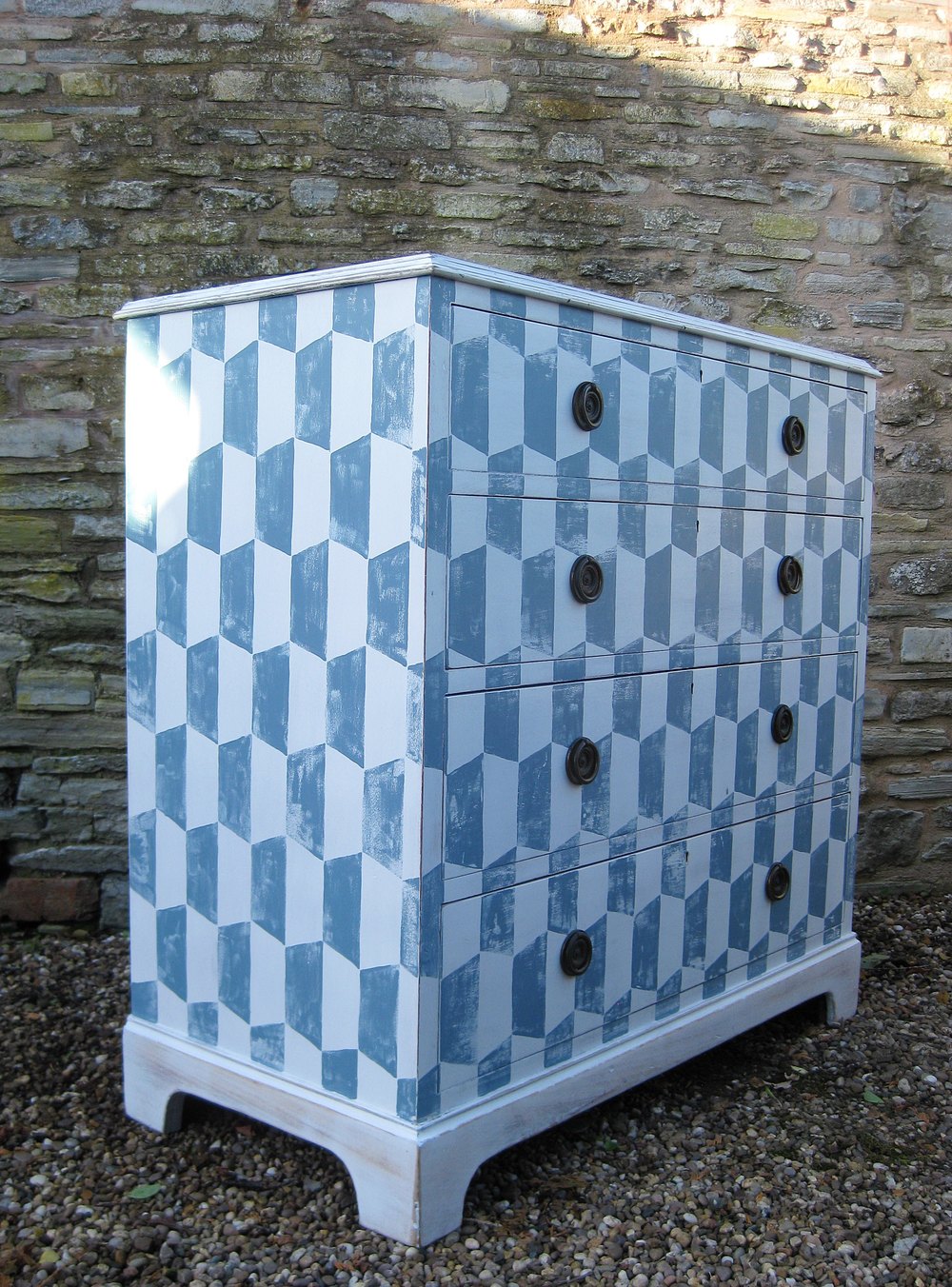 Four drawers of graduating depths, original ring pull handles sitting on bracket feet.