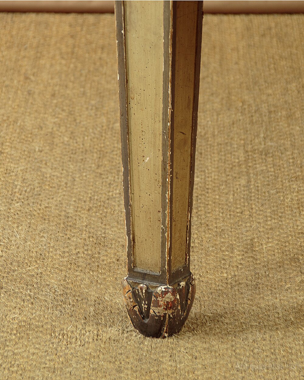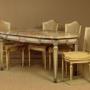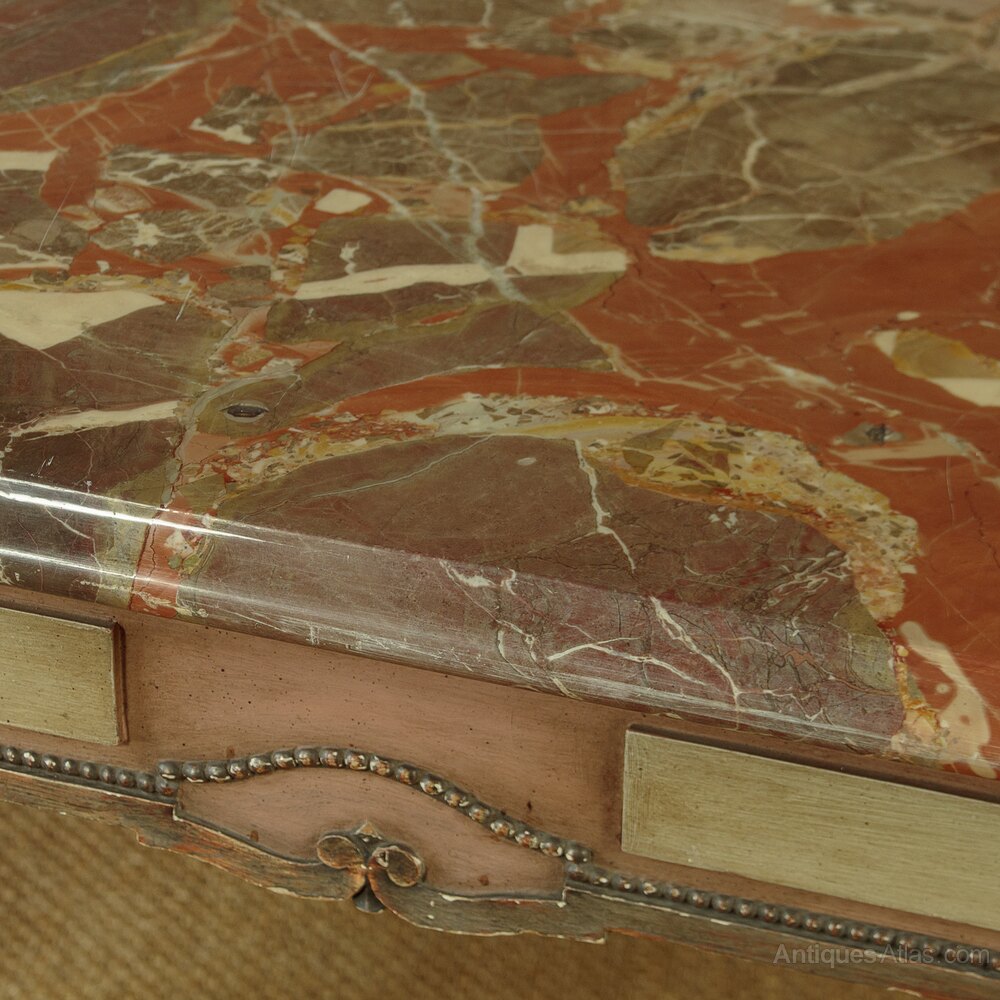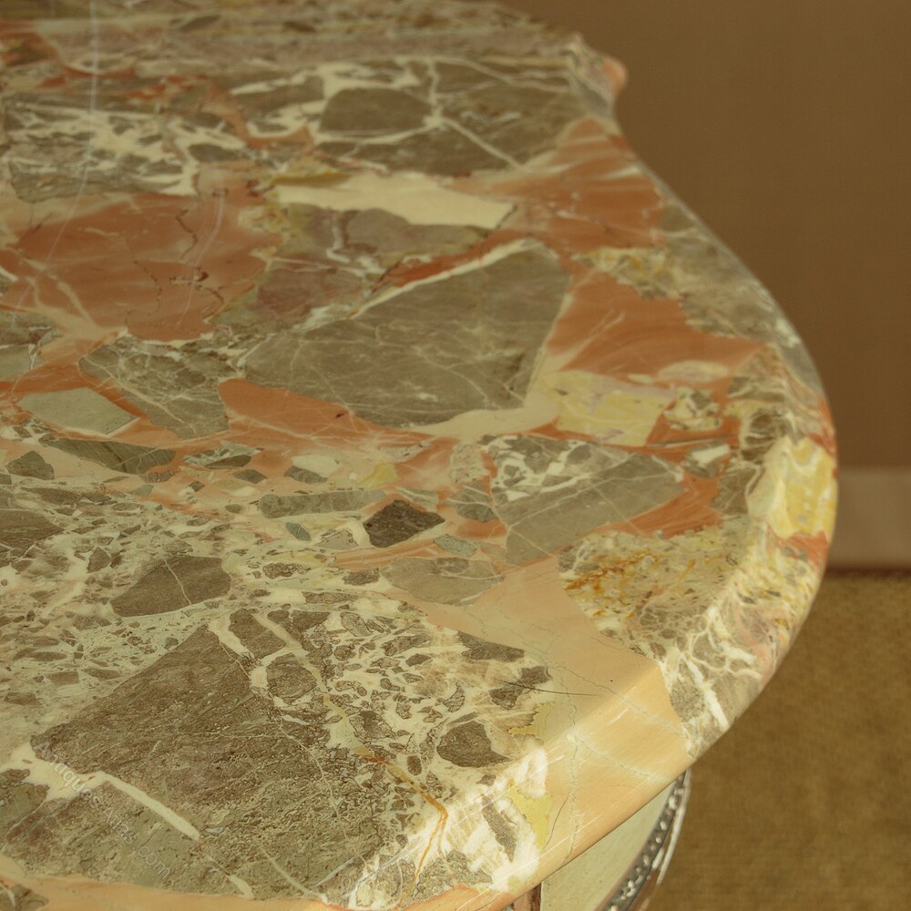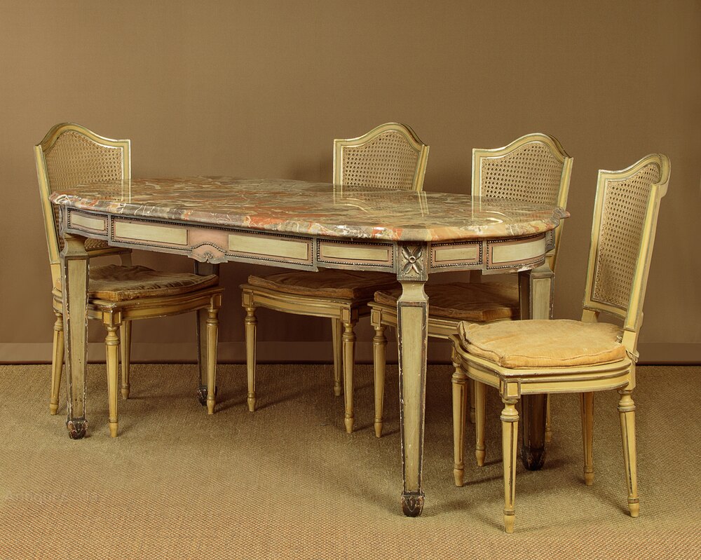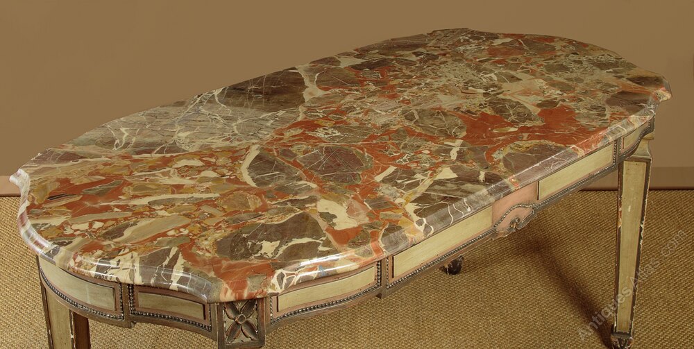 Unusual marble top and painted dining table c.1950. Beautifully figured single piece marble top, big enough to seat six people. With shaped ends and moulded edges. On a painted wooden base with moulded detail to the apron, raised on tapering square legs with carved feet. Presented as found, with a couple of chips and some light scratches to the marble and obvious wear to the paint work which is worn and rubbed through in places. Otherwise good condition, solid and sturdy.