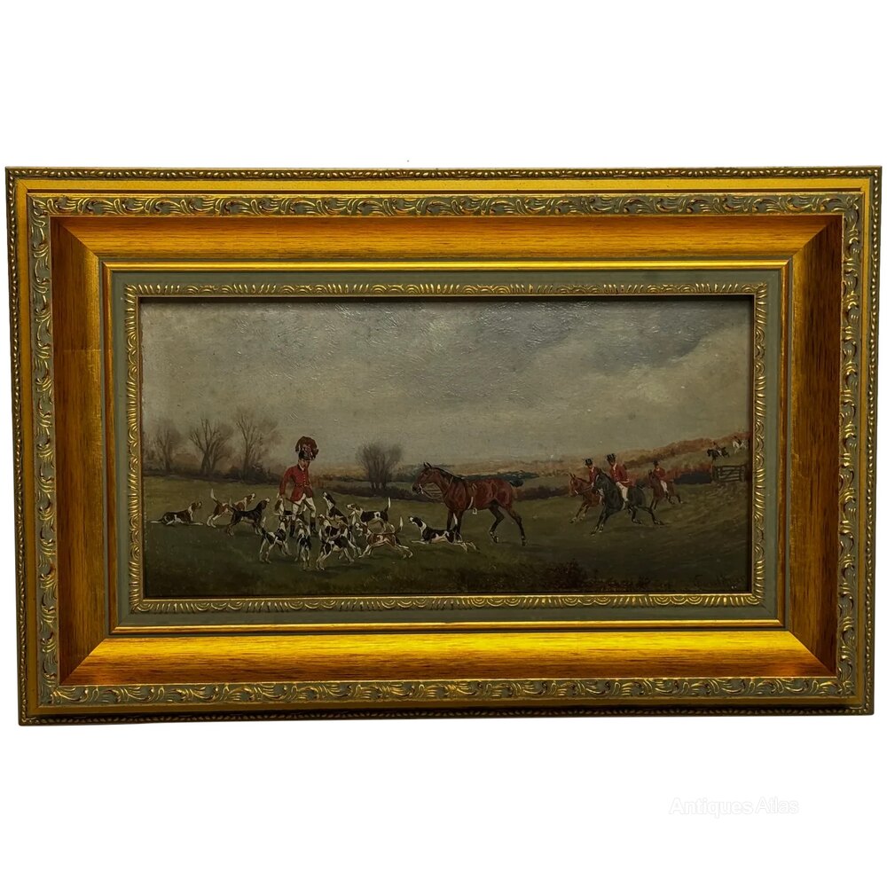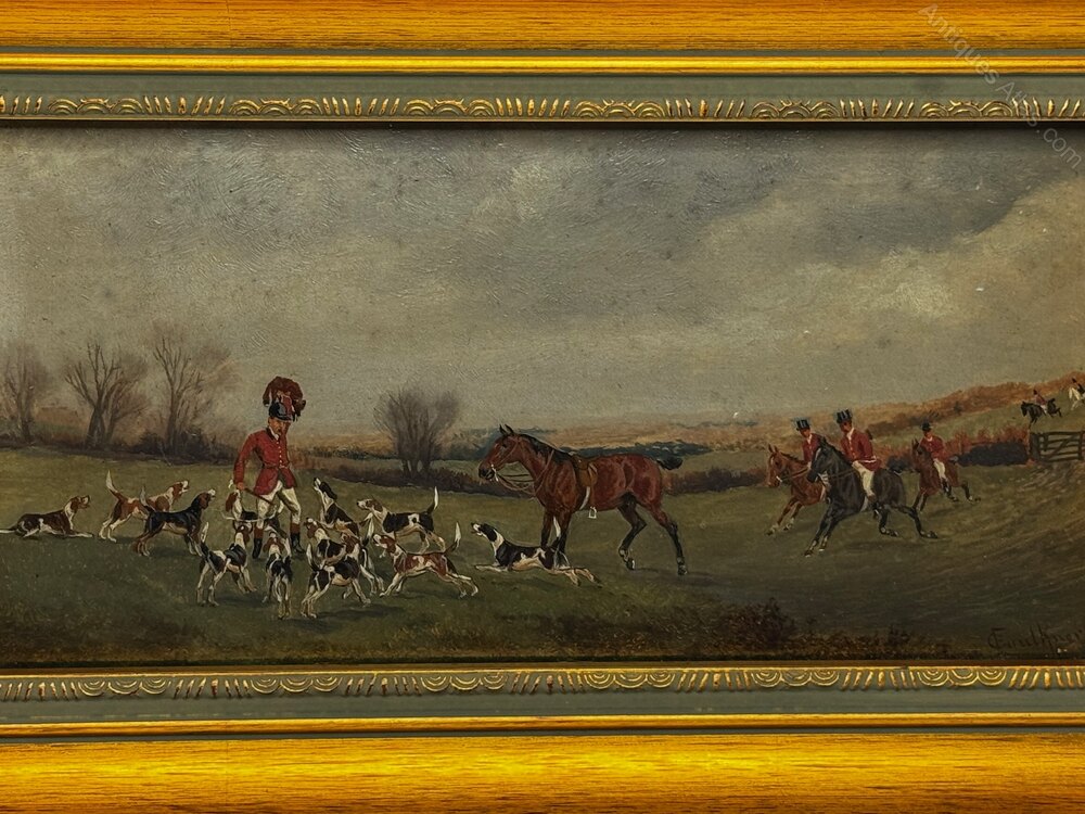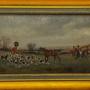 The choice of board provides a solid, responsive surface that enables tightly controlled brushwork and crisp articulation in the horses, hounds, and surrounding terrain. Faulkner’s palette of layered greys, umbers, and subdued greens creates a unified, atmospheric effect characteristic of Victorian sporting art.