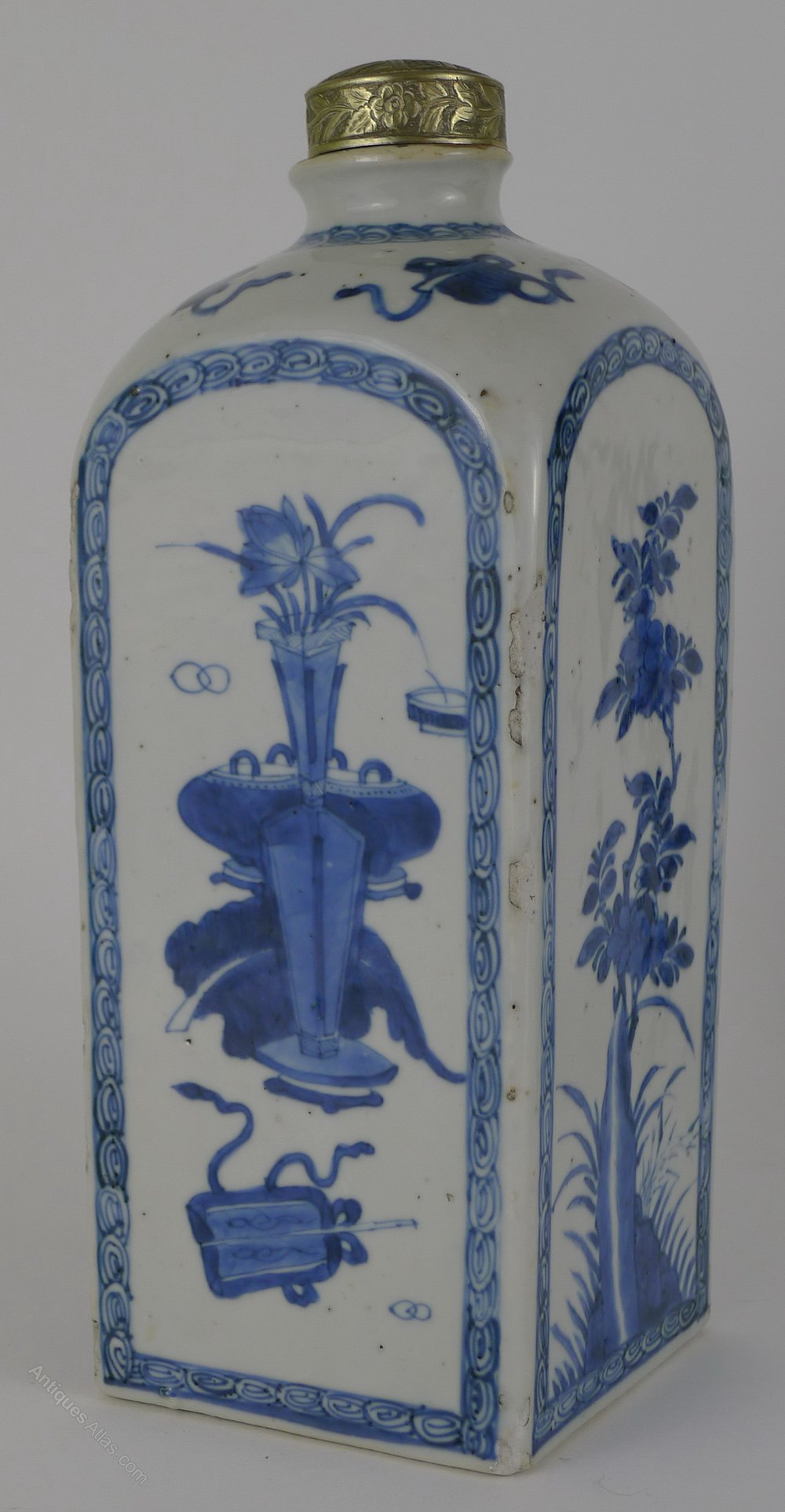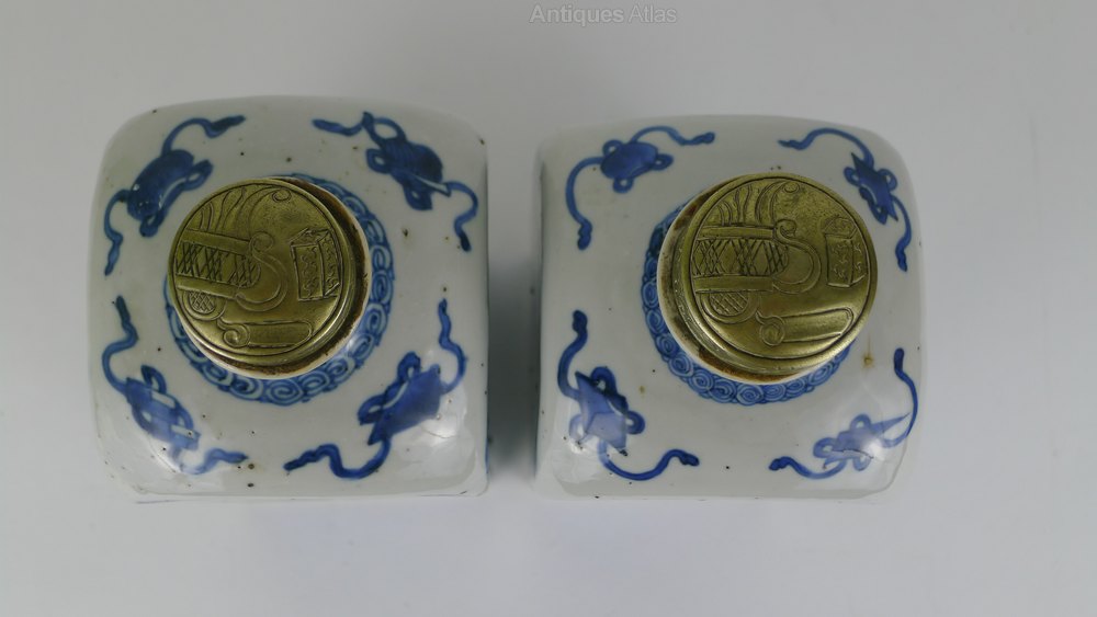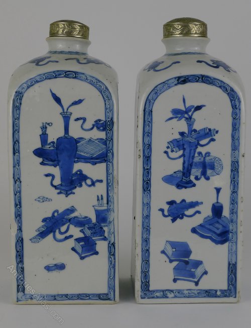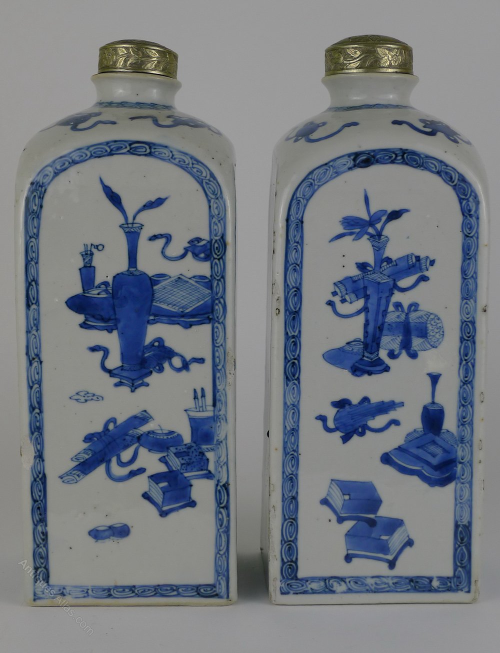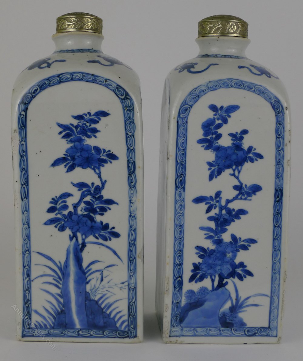 We are selling this pair of lovely quality 17th Century Chinese blue and white kangxi vases. Each one decorated with flowering prunas, vases and scrolls. They have been given 19th Century metal lids at sometime in their life.