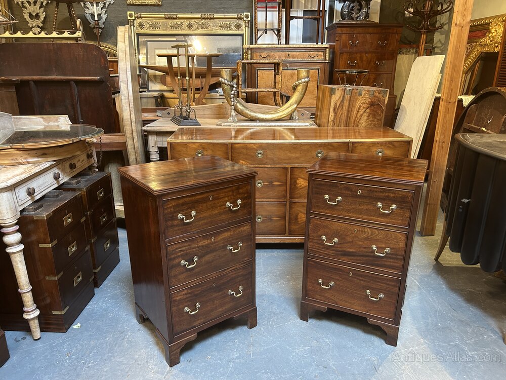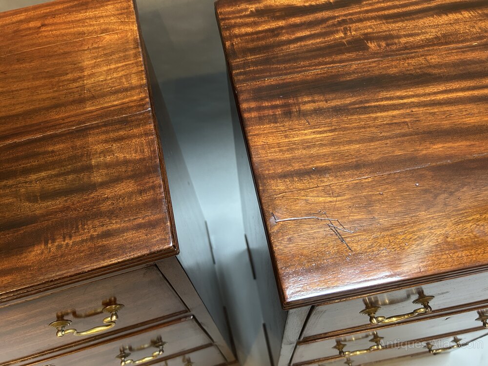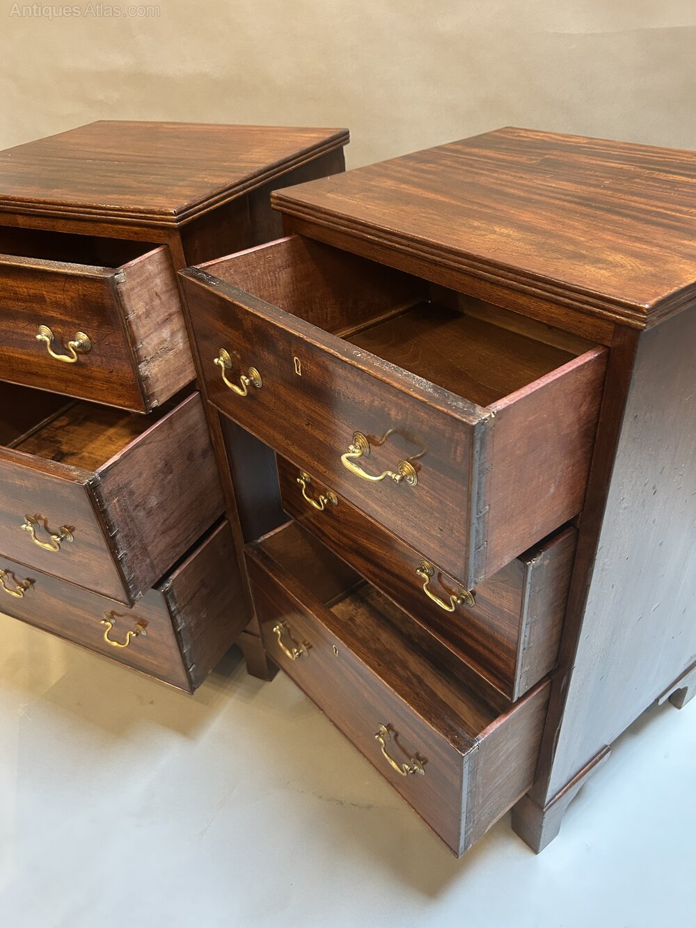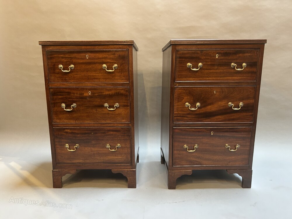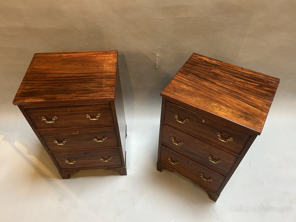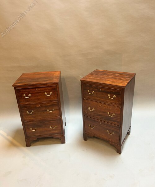 A pair of antique figured mahogany chest of drawers, the reeded edge top over 3 graduated drawers with swan-neck handles, raised on bracket feet.