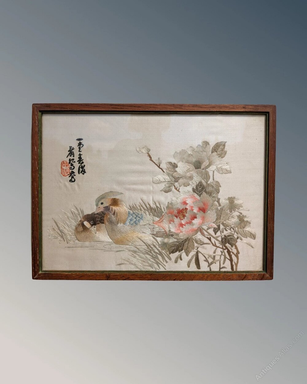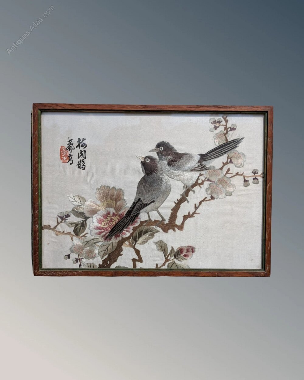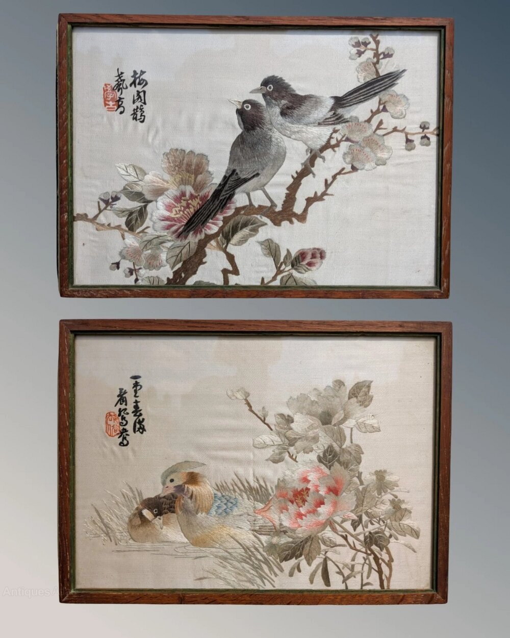 The pictures are very finely embroidered in silk and have pretty pastel shades. The pair are both hand signed by the artisan with their signature and red chop mark to the top left.