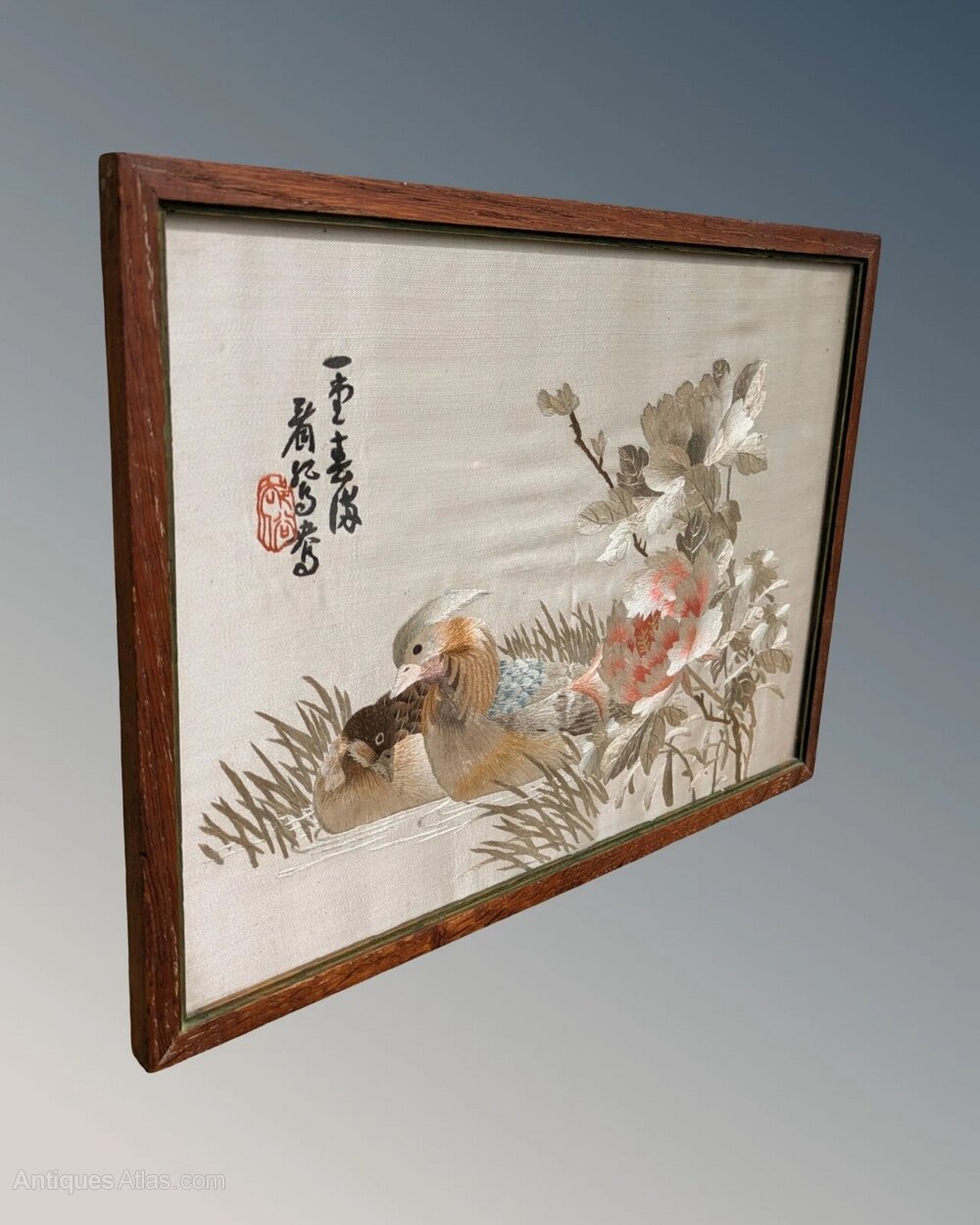 An attractive pair of late 19th / early 20th century hand embroidered Chinese pictures on silk depicting garden birds in tree branches and mandarin ducks on water with chrysanthemum blossom.