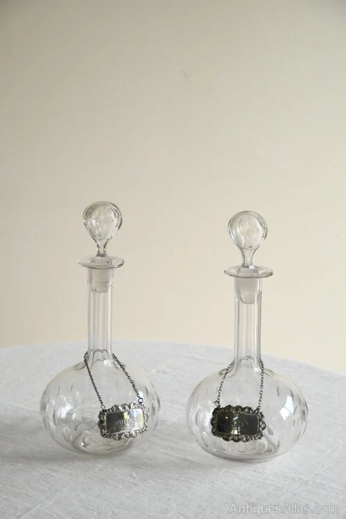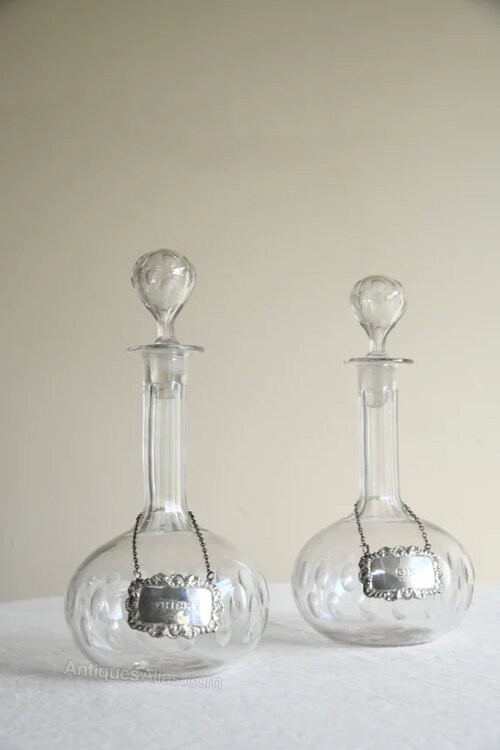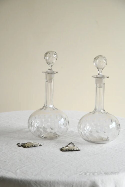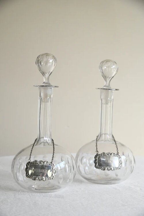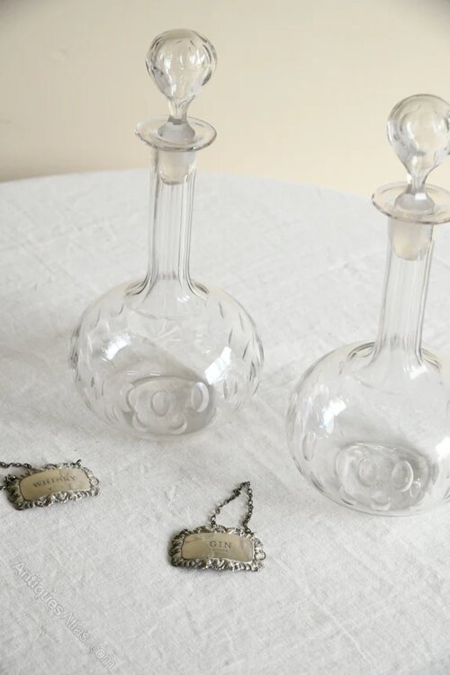 Pair Antique Globe Decanters. Pair of 19th century cut glass globe decanters, each of elegant bulbous form with a tall slender neck and original stopper.The bodies are decorated with cut detailing, and each retains a hanging silver label, marked “Whisky” and “Gin,”