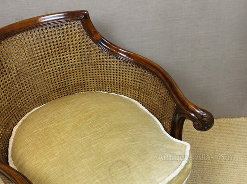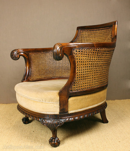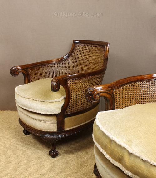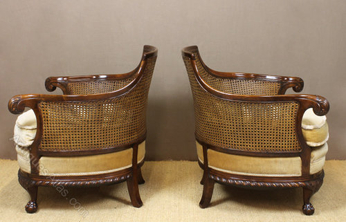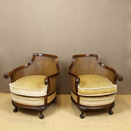 Fantastic pair of early 20th.c. bergere or canework armchairs c.1920. Elegantly shaped frames in walnut with carved detail and ball and claw feet. Original double canework back and sides in superb condition. Feather cushions and servicable upholstery with a ring mark to one seat.
