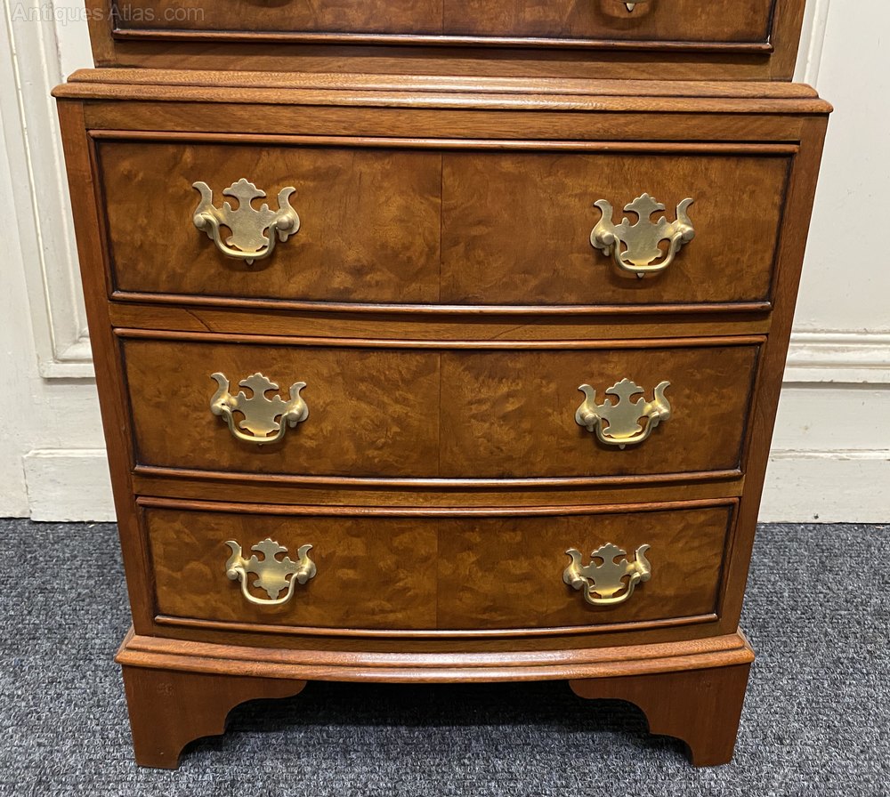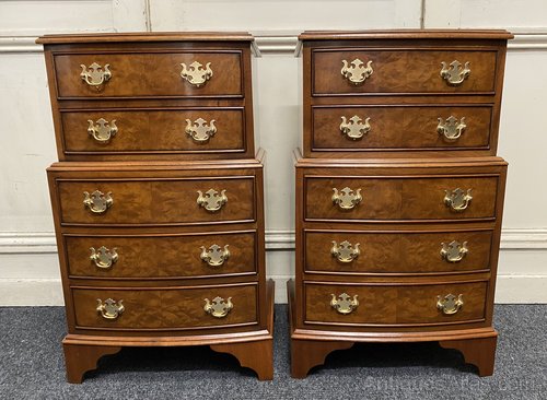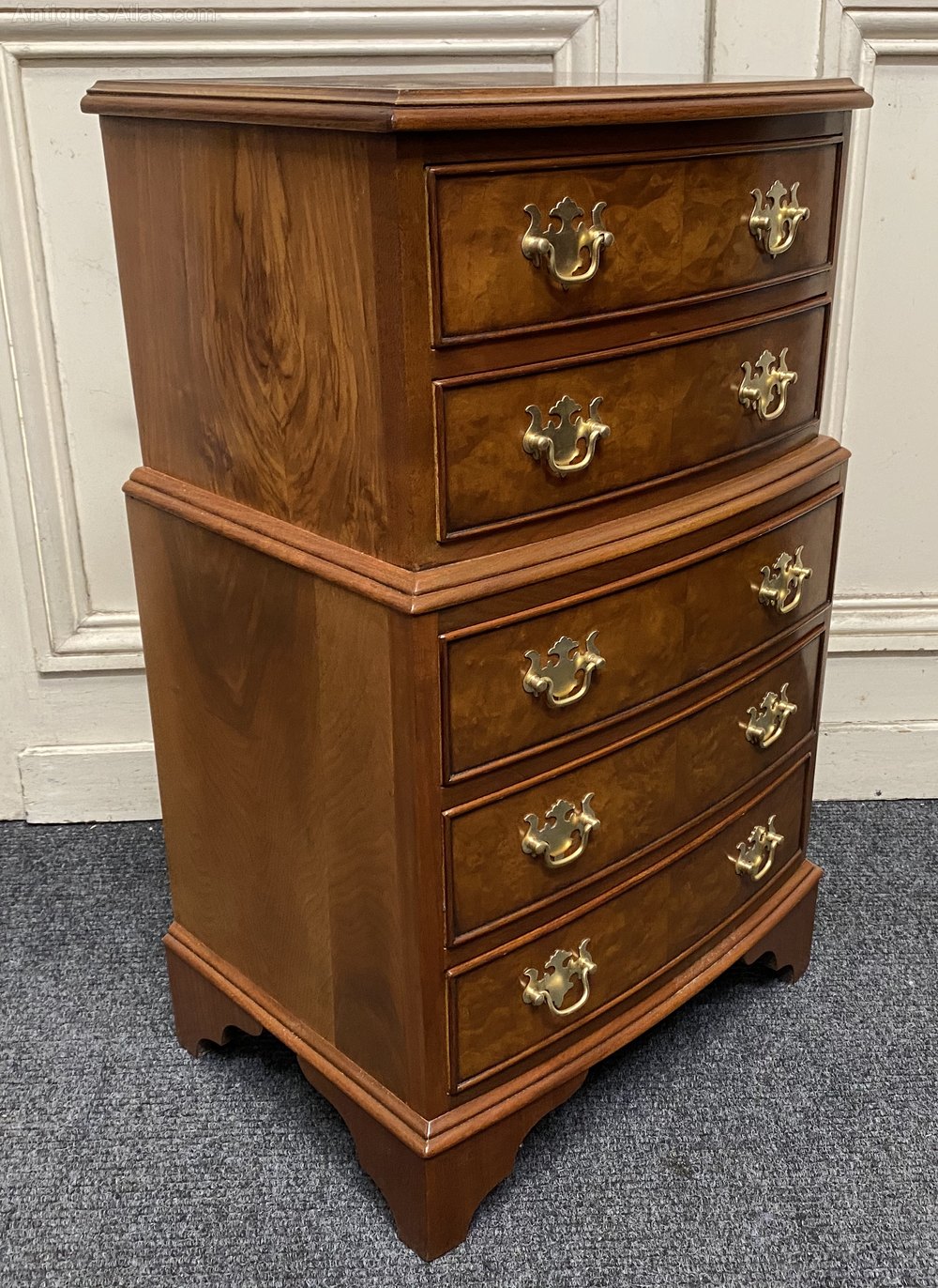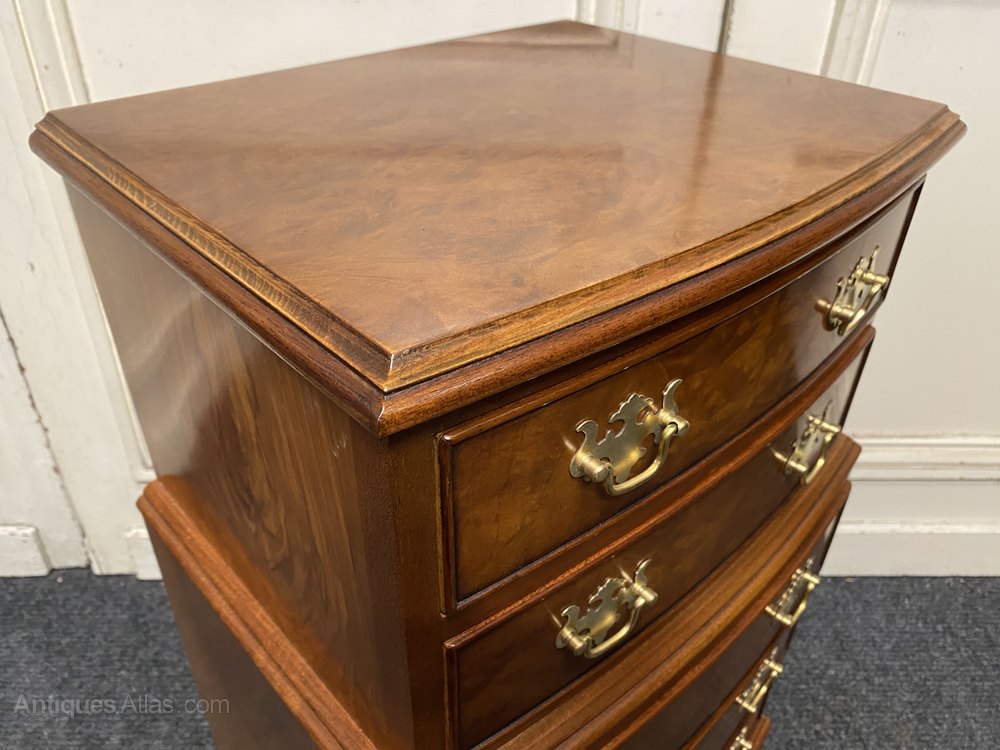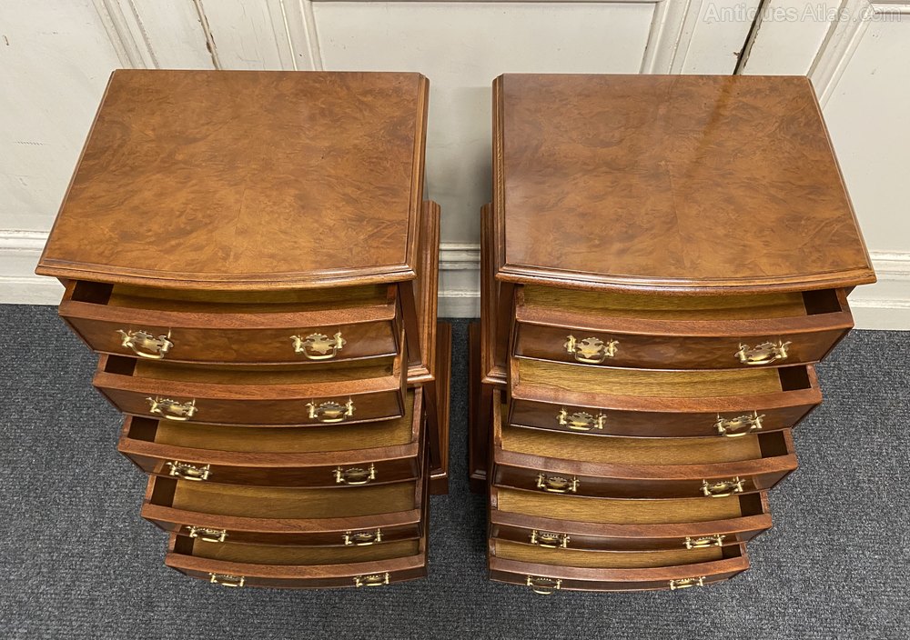 A pretty pair of Bow fronted Bedside Chest of Drawers or Nightstands. Made from Walnut with Burr Walnut. A nice design with stepping out in the middle. All the drawers run smoothly and fitted with original brass handles.