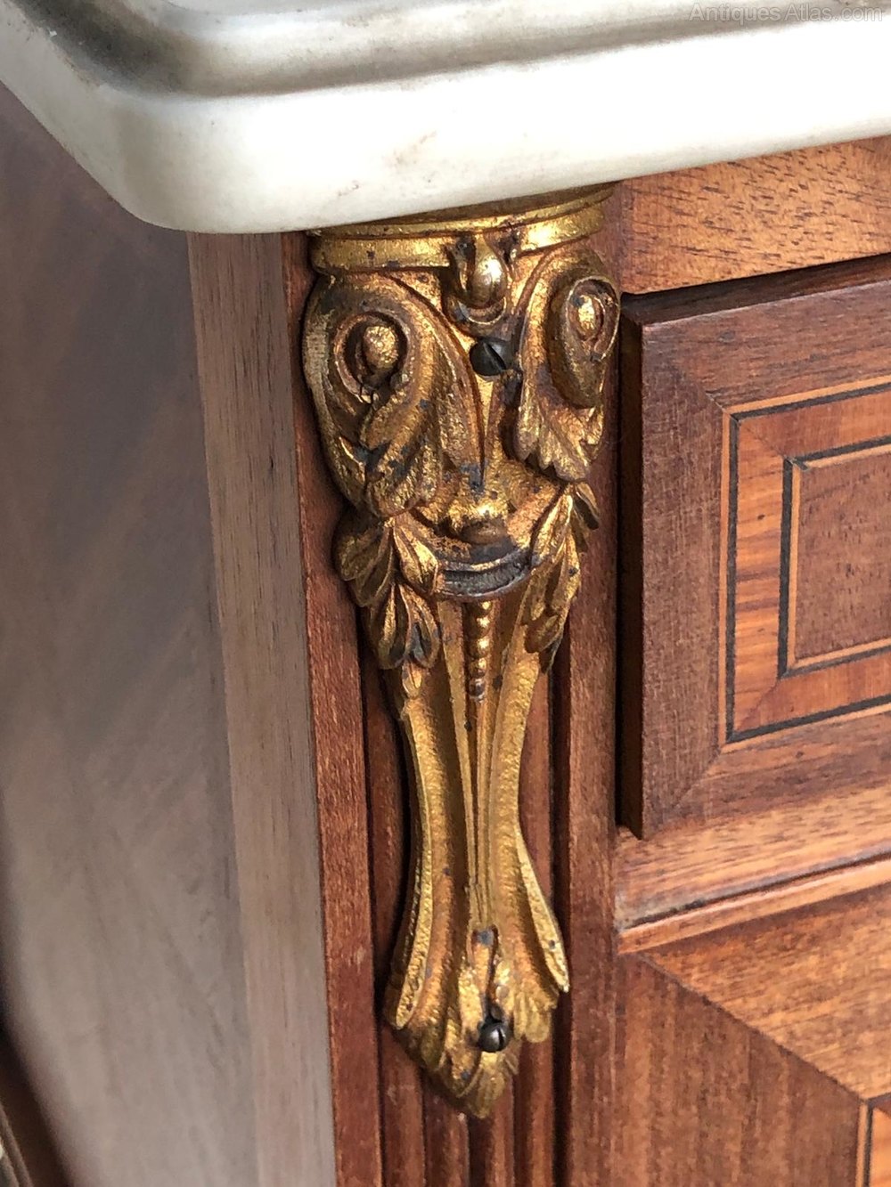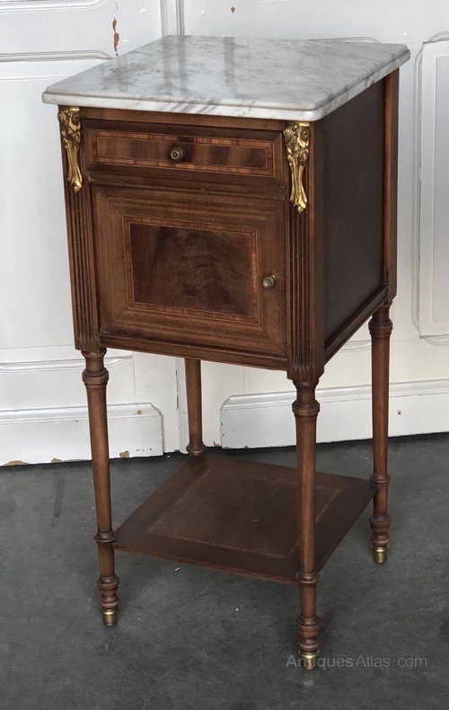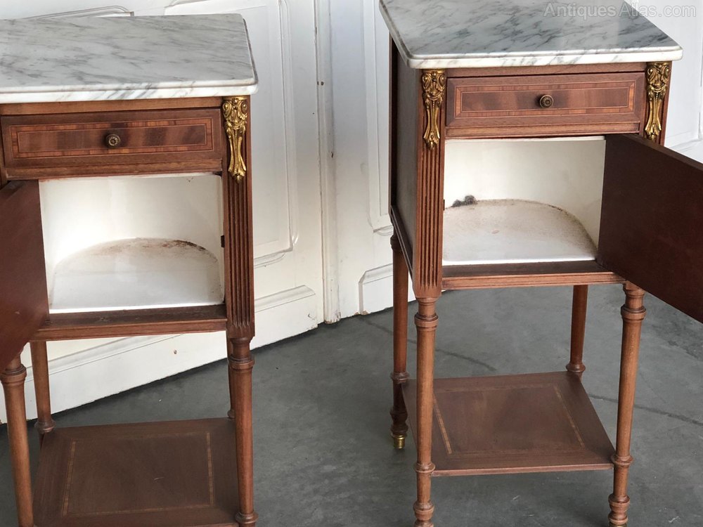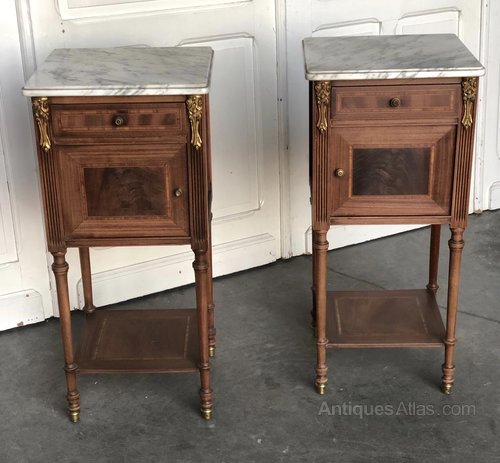 A delightful pair of late Victorian French bedside cupboards or cabinets. Made from walnut with tulip wood cross band inlay. The orginal marble tops are in perfect condition. Each has a single drawer with cupboard under. The ormulu mounts are crisp and of good quality, infact as can bee seen from the drawer linings this pair is of excellent quality throughout.