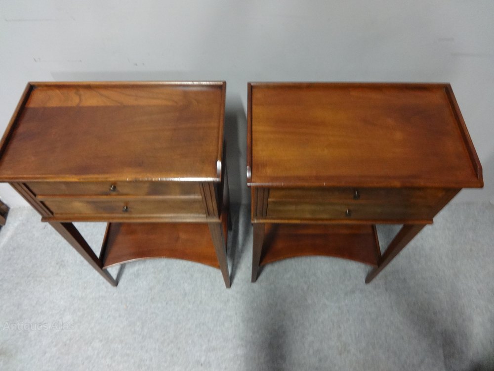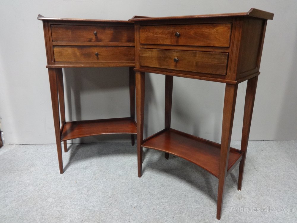 A very nice pair of French mahogany bedside lamp chests with two opening drawers, and lower shelf, freestanding and in excellent condition.