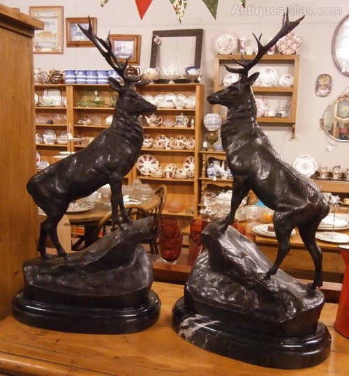 A pair of impressive hollow cast bronze 12 point stags, each standing on a rocky outcrop. The pair are mounted on Italian marble plinths and signed J Moigniez to the base.
