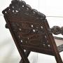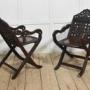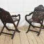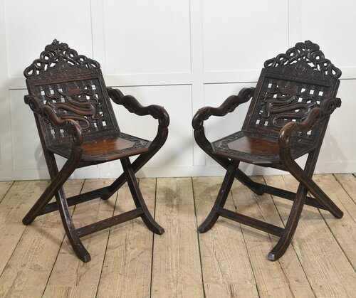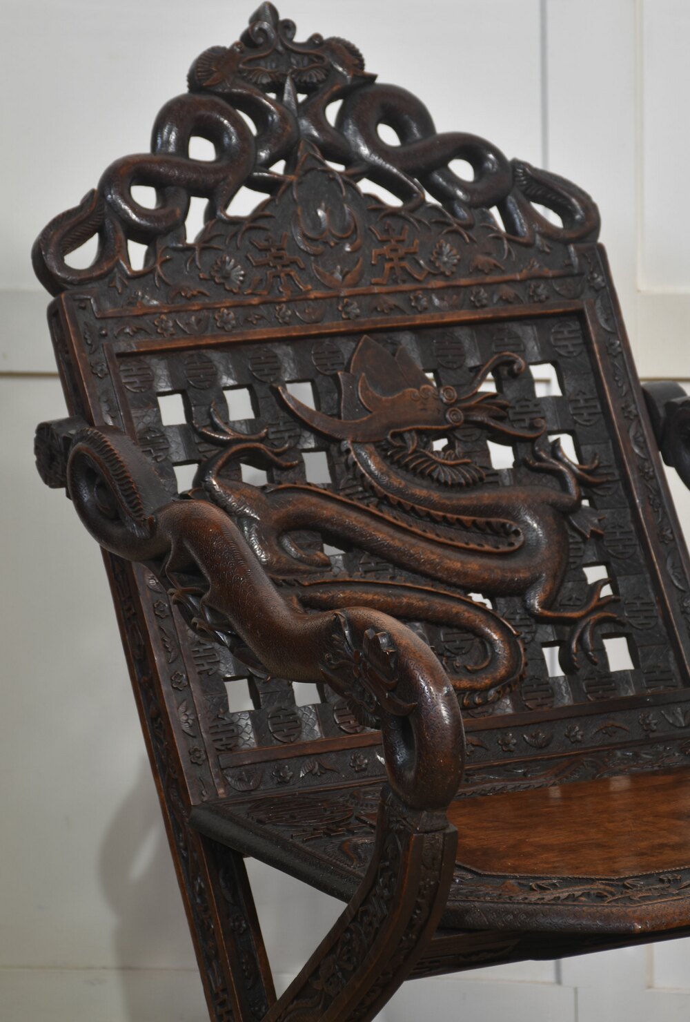 Pair of 19th-century Chinese folding armchairs, the arched backs profusely carved and detailed with dragons to the solid seat with further carved decoration.Flanked by shaped arms depicting serpents. All raised on square supports united by stretchers.