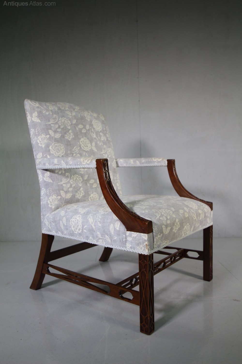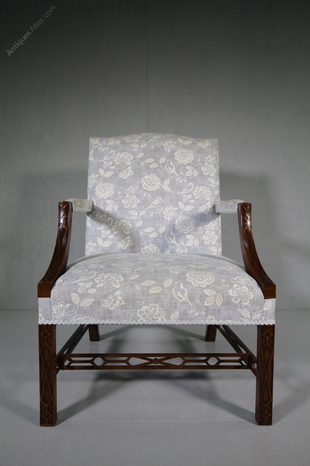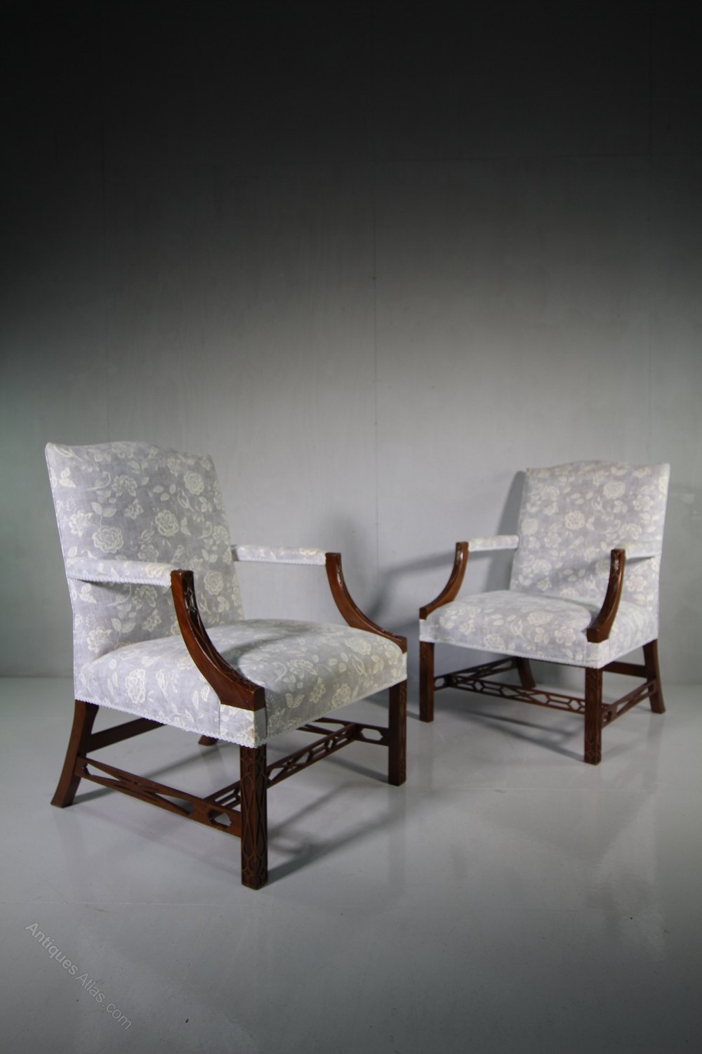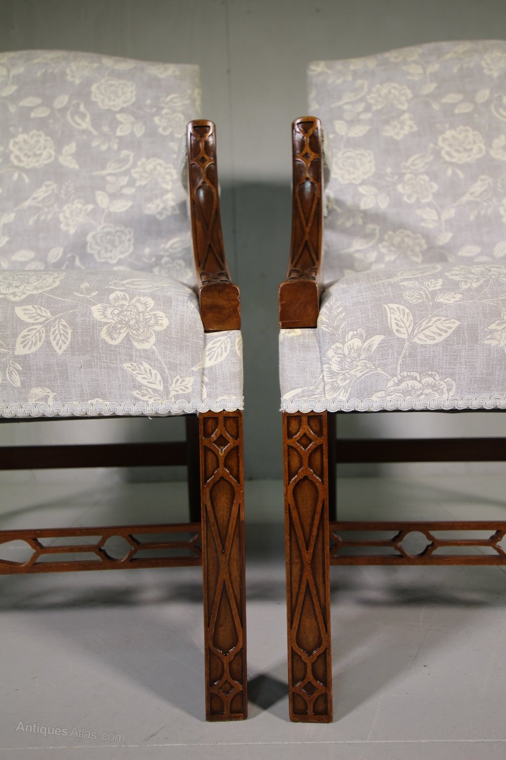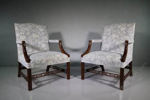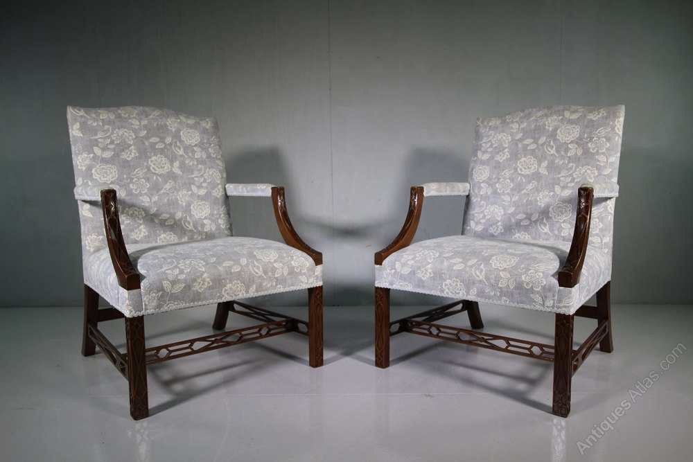 A superb quality made pair of vintage mahogany Gainsborough armchairs. Made in a large, generous scale, each Gainsborough armchair features blind fret work decorations, open arms and upholstered in a beautiful fabric, which isnt new, but is reasonably clean and complete with recent, 2015 fire safety labels, from when they were re-upholstered. We also have another identical pair available.