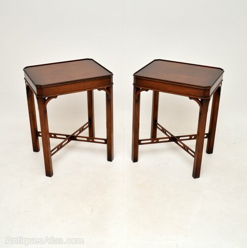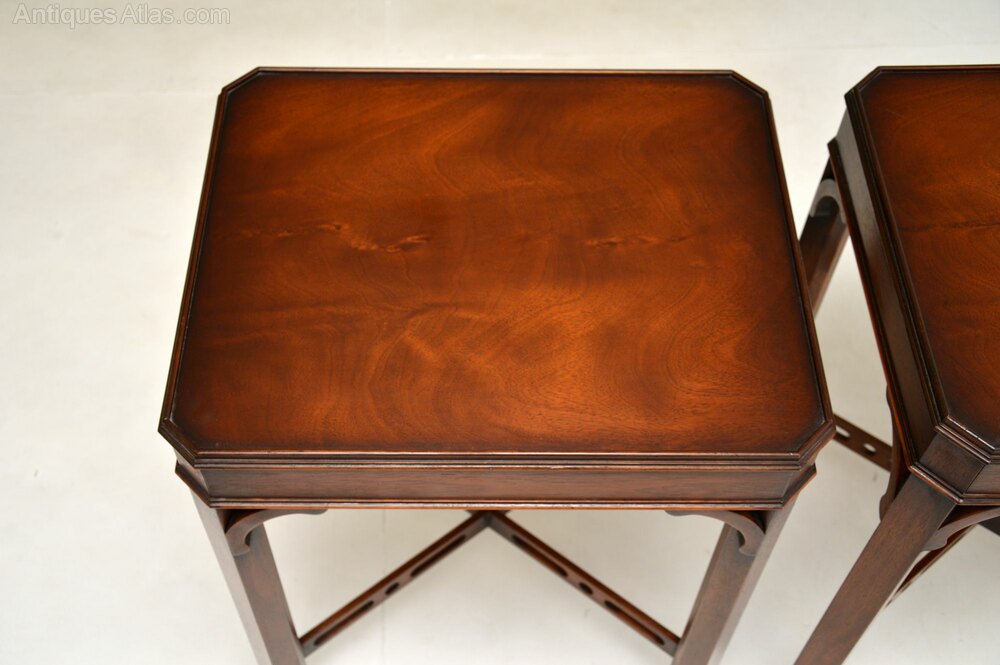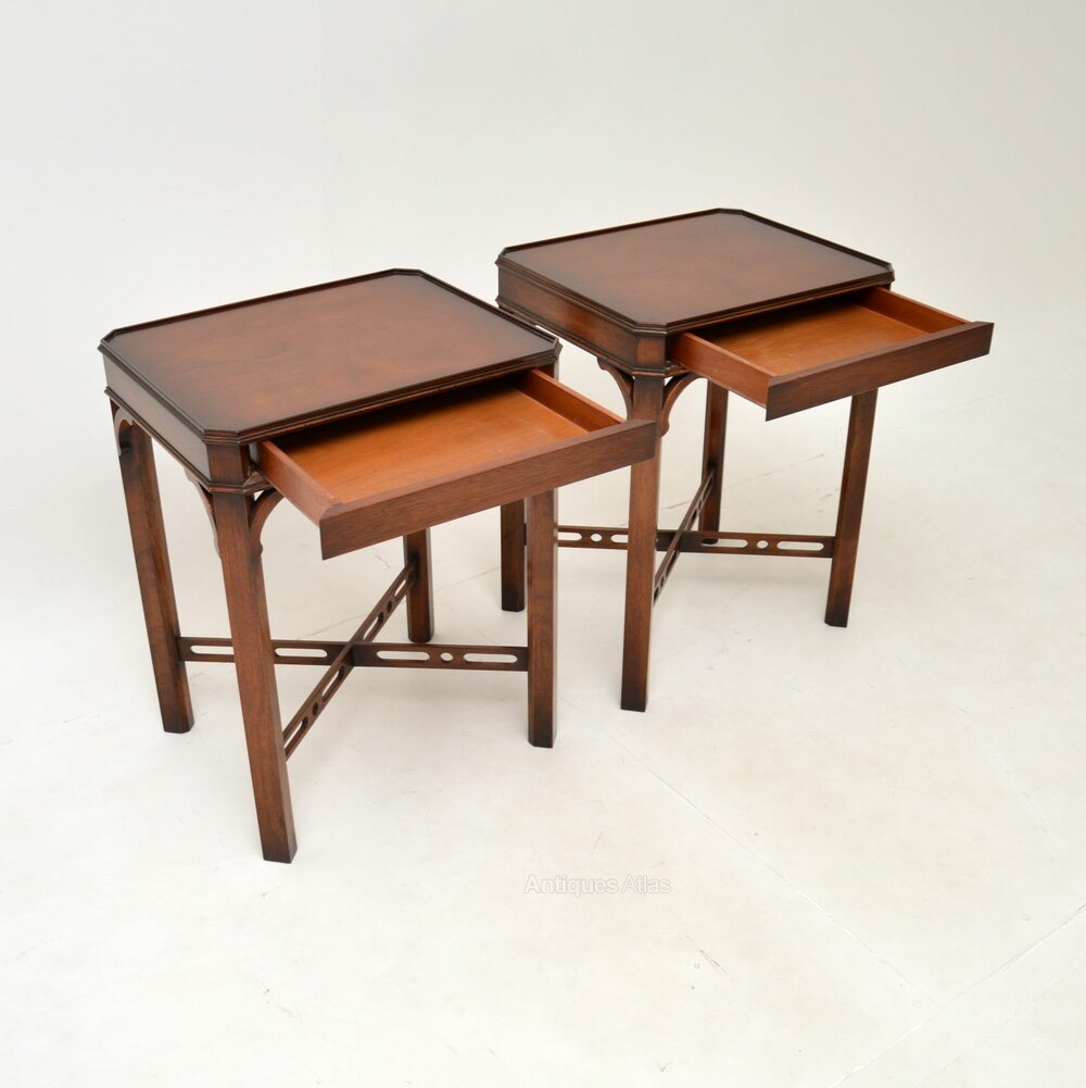 They are of excellent quality and are a useful size to be used as lamp antique tables. The rectangular tops have canted corners and slightly raised edges, the legs have lovely pierced stretchers. There is also a single drawer built in to each top. They are nicely finished on all sides, so can be used as free standing items.