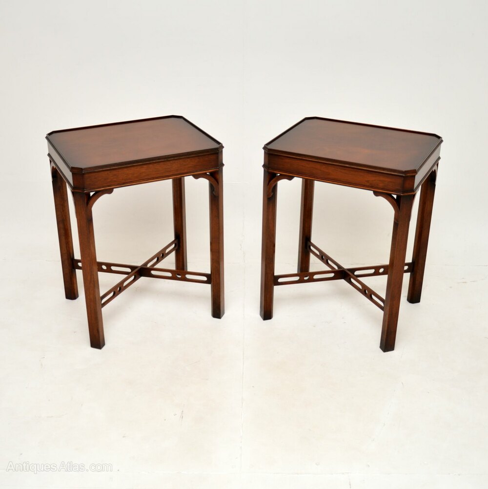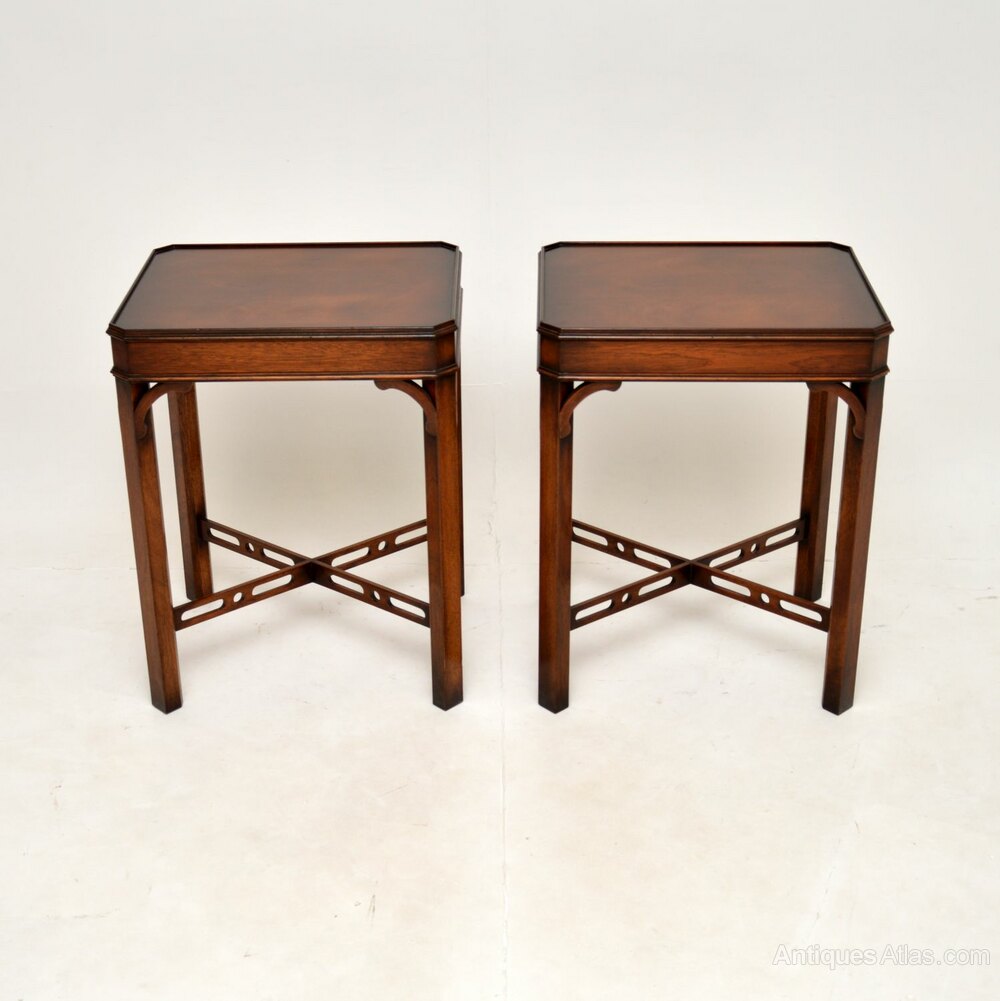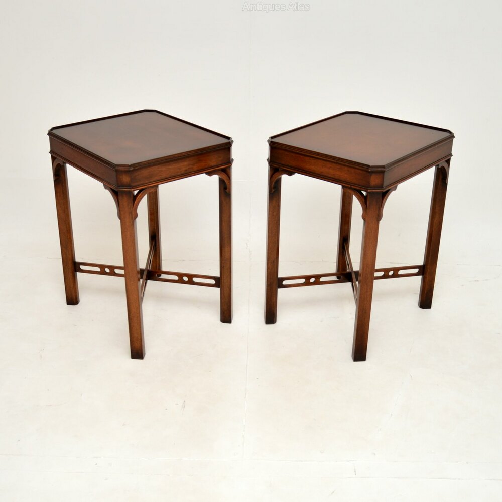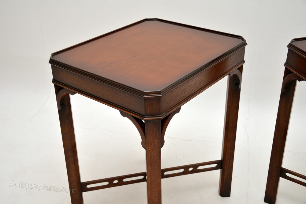 A smart and very useful pair of antique mahogany side antique tables in the Georgian style. There were made in England, they date from around the 1950’s.