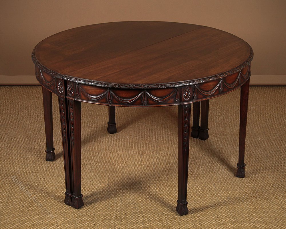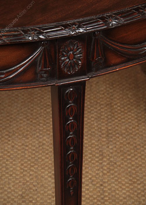 Pair of Adams style demi-lune side antique tables c.1930. Semi circular tables solid mahogany tops with carved edges over aprons carved with cloth swags and flower head roundels with a slim moulding to the lower edge. Raised on square legs carved with harebell garlands to the fronts and tapering to carved scrolling acanthus feet. Ideal as a pair of elegant console tables or can be pushed together to make a circular table for six. Very good condition. Cleaned and waxed in our workshops.