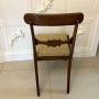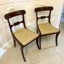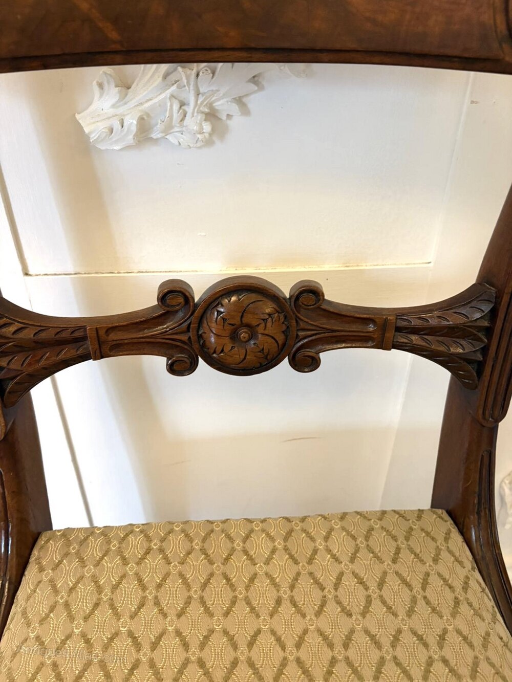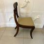 Pair of antique Regency carved figured mahogany side chairs having a quality figured mahogany carved top, carved mahogany splat to the centre, newly reupholstered drop in seats in a quality fabric standing on reeded sabre legs to the front and outswept back legs.