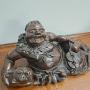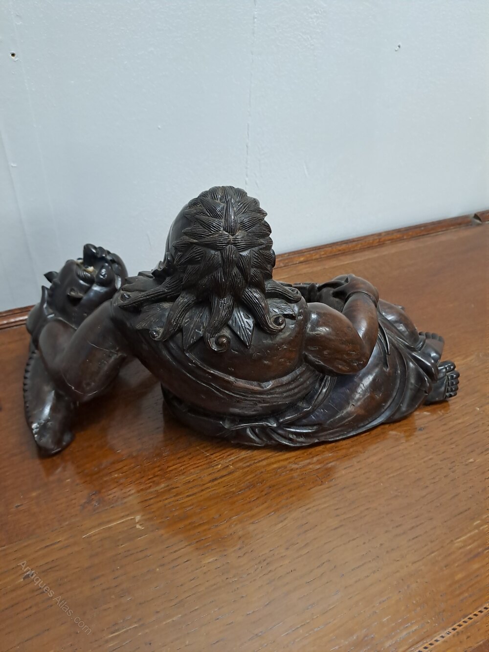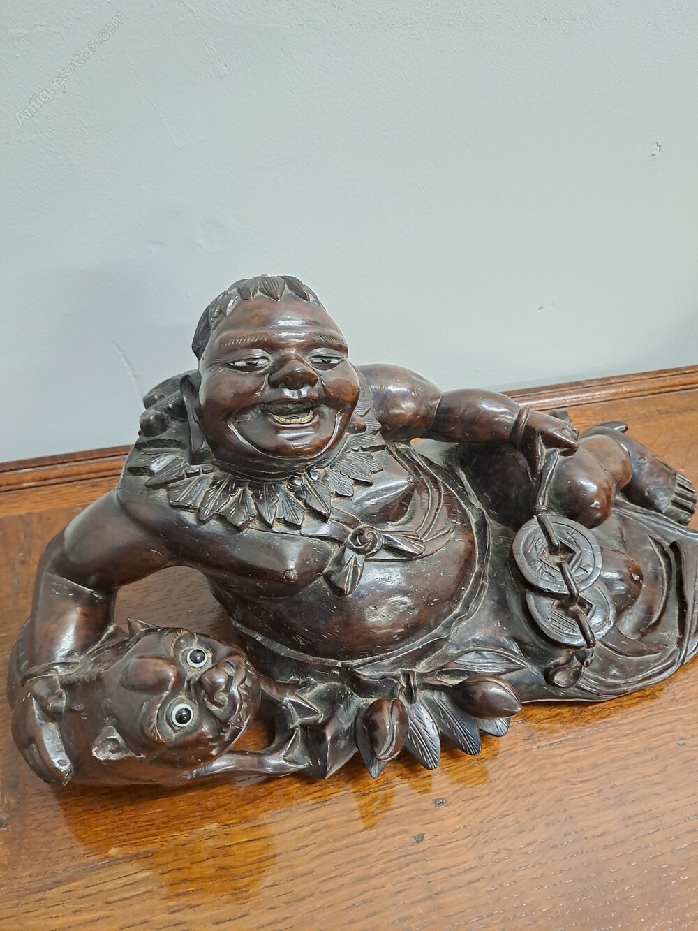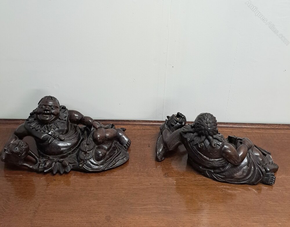 A finely carved pair of antique Chinese hardwood figures depicting Liu Hai, the Daoist immortal associated with prosperity and good fortune. Each figure shows the cheerful immortal reclining with his characteristic three-legged toad and string of coins — symbols of wealth and luck. Beautifully detailed with expressive faces, flowing robes, and rich dark patina developed over time. A delightful and auspicious pair that display exceptional craftsmanship.