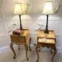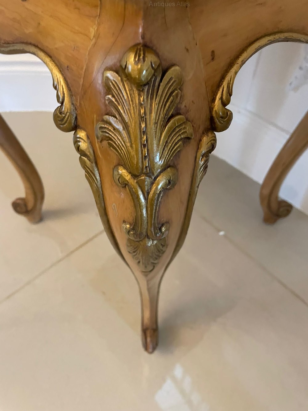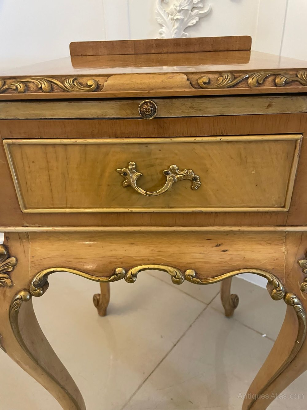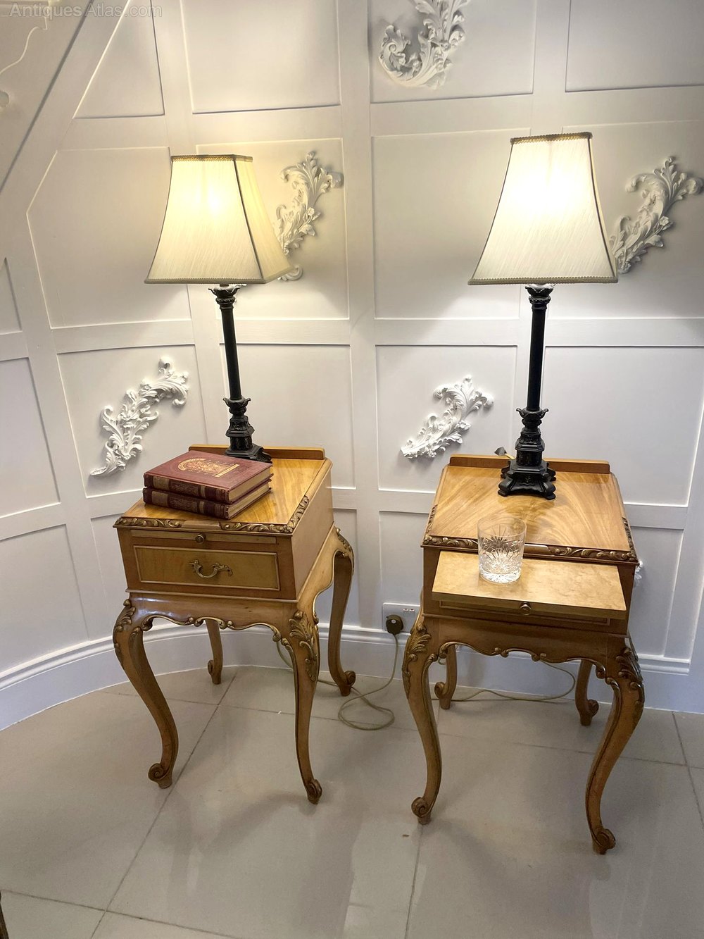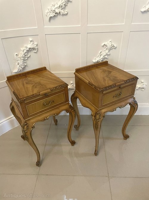 Pair of antique quality figured walnut bedside antique tables having a quality figured walnut top with a carved moulded edge above a pull out slide, two single drawers with a cockbeeded edge, original shaped brass handle, shaped carved frieze and standing on four elegant shaped carved and gilded cabriole legs with scroll feet