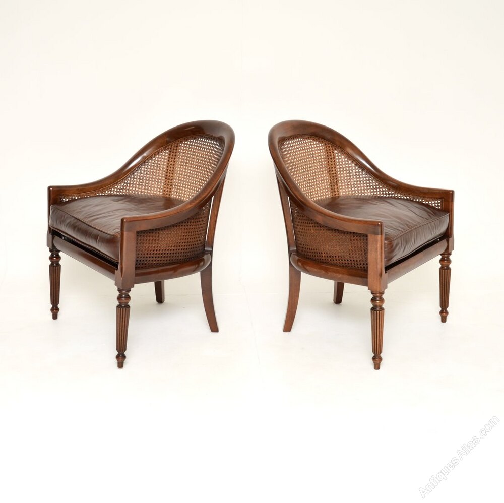 The quality is superb with lovely proportions, they are comfortable and supportive, with plump feather filled leather cushions. The curved frames sit on fluted legs and have beautiful cane work on the back and sides.
