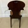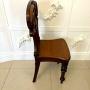 These chairs feature finely carved scrollwork, shaped back panels with a shield motif and serpentine seats that gently flare forward. The turned front legs and splayed rear supports provide both character and strength. The mahogany timber has matured into a warm, inviting colour, showcasing attractive grain throughout.
