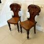 A superb pair of antique Victorian mahogany hall / side chairs beautifully crafted with rich carved detail and elegant sweeping forms—an excellent example of mid-19th-century decorative seating.
