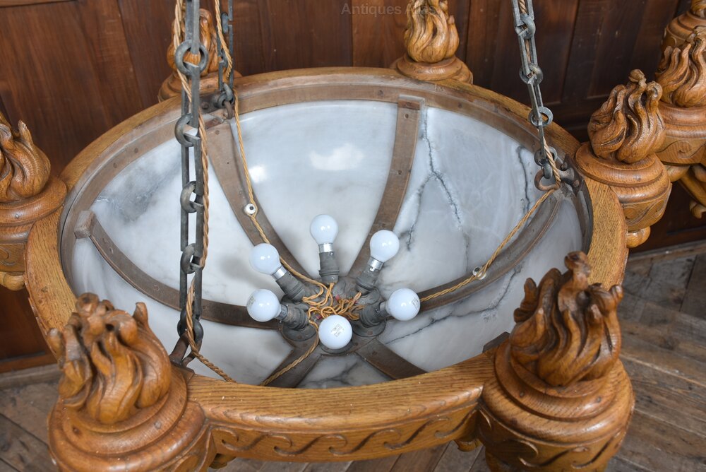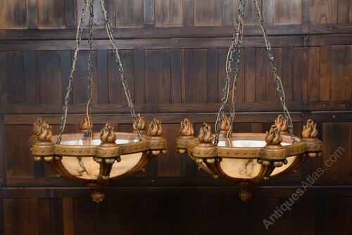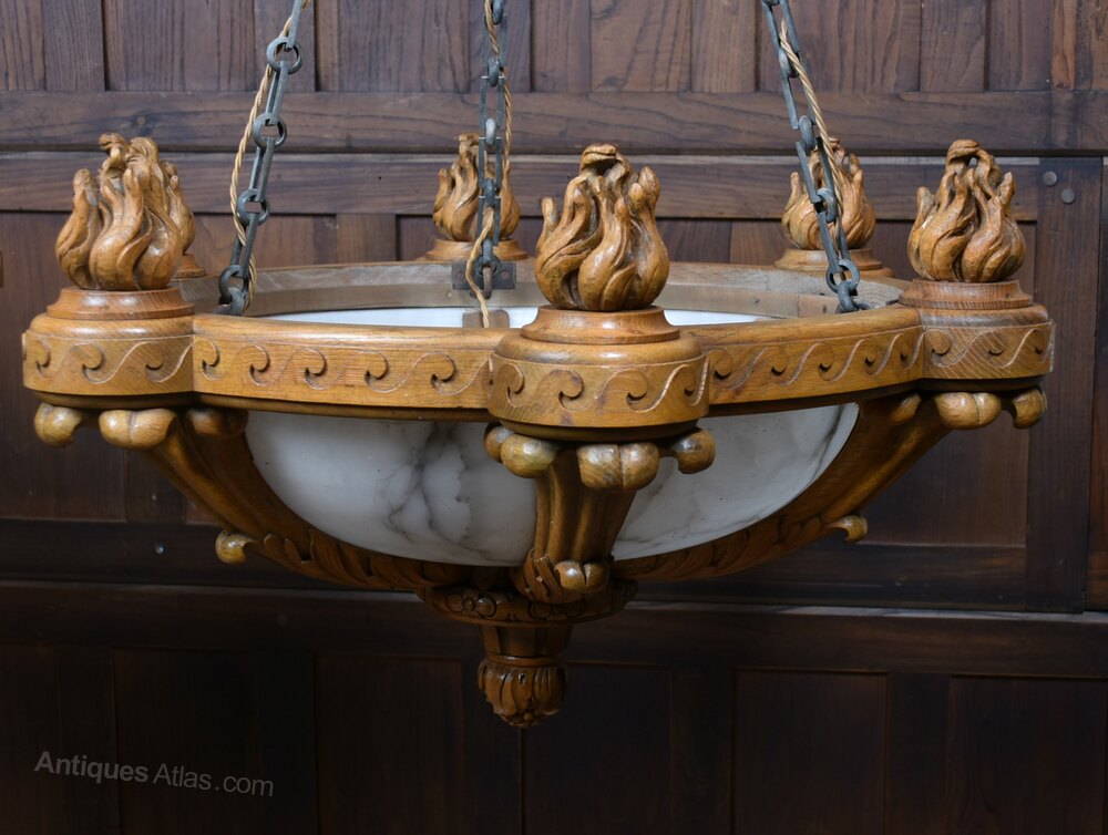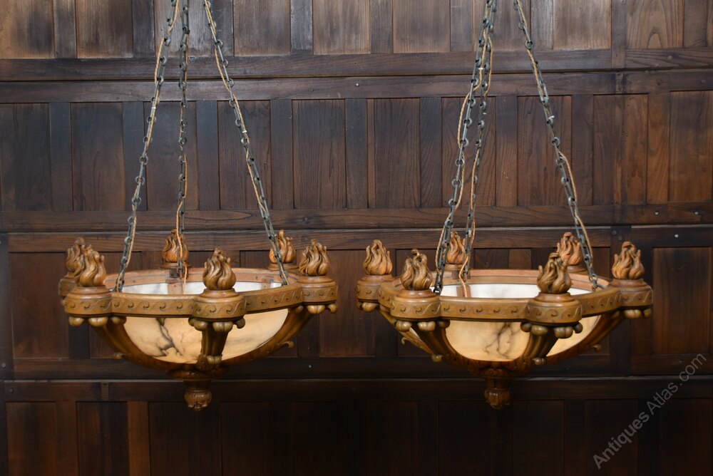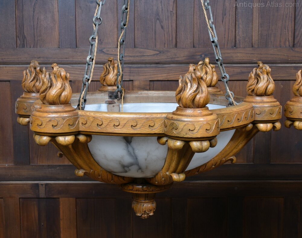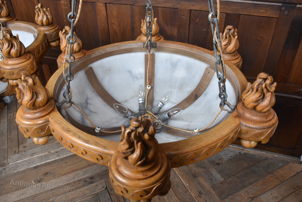 A superb pair of large Art Deco ceiling light fittings in excellent antique condition. The solid oak frames are boldly carved with stylised flame finials and scrolling Deco motifs, the workmanship crisp and confident. Each shade is formed from multiple shaped alabaster panels set within the oak gallery — a more refined construction than the usual single‑bowl pendants. Removed from Castle Dunlossit on the Isle of Islay, they carry desirable Scottish estate provenance. Substantial, architectural and clearly commissioned for an important interior, pairs of this scale and quality are increasingly scarce. A rare opportunity to acquire a matched pair of statement Art Deco lights, elegant and steeped in Hebridean history.