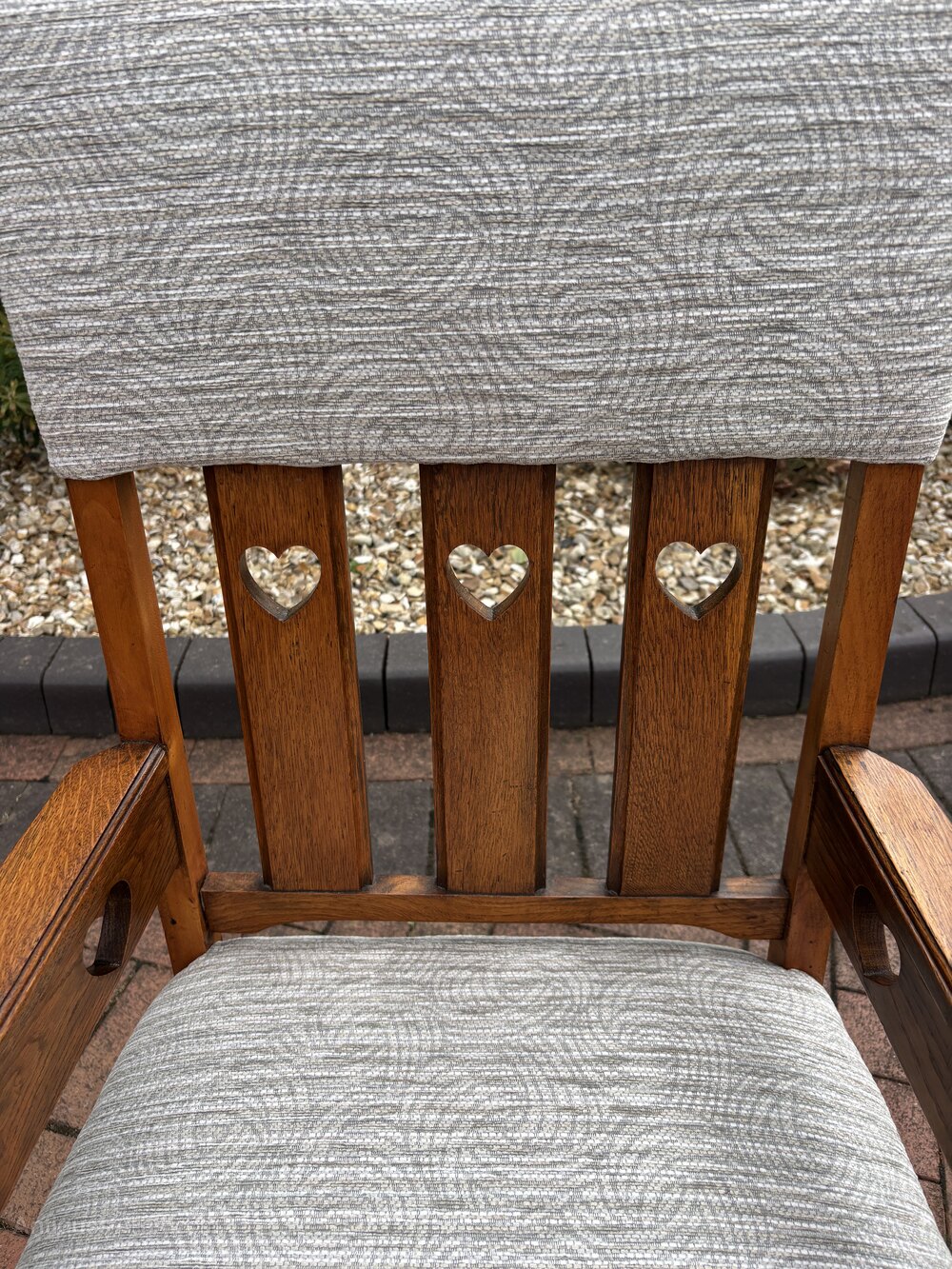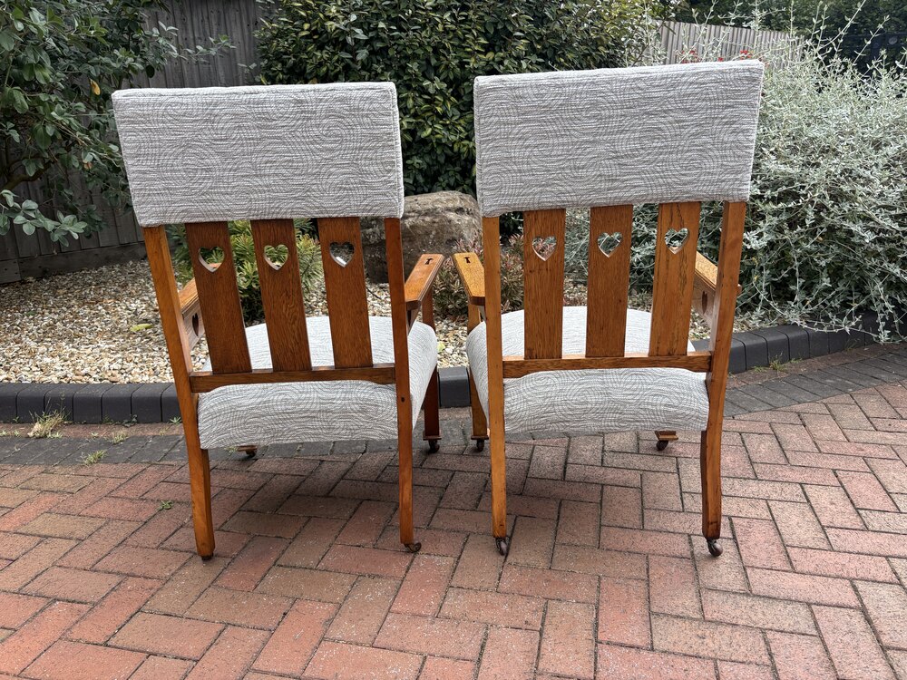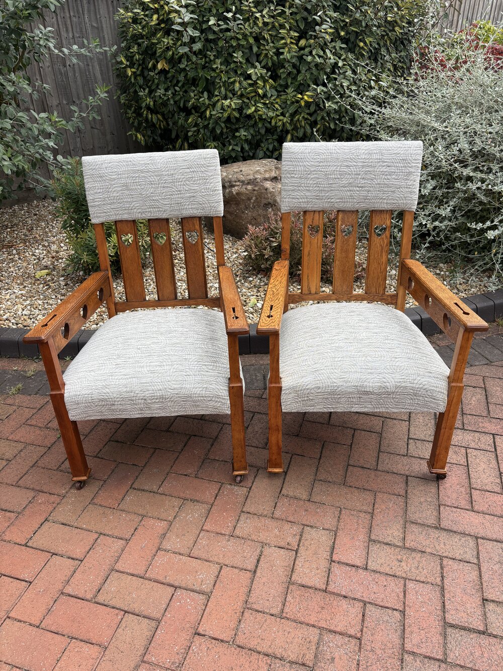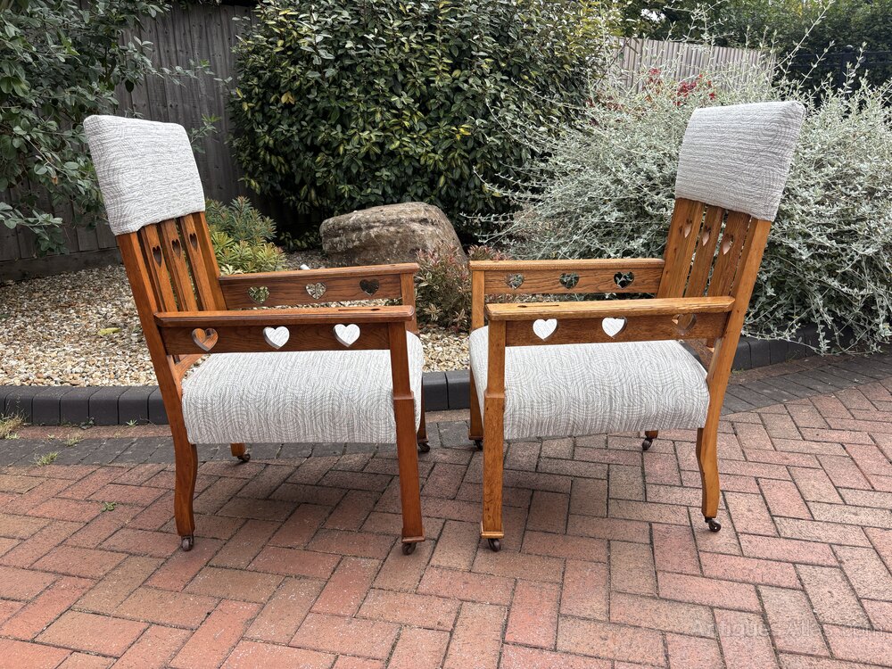 A pair of Arts & Crafts lounge chairs c1900, made of walnut and oak. Pierced hearts to the backrests and underarm supports with pierced tulips to the armrests, and stand on square legs with original casters. The chairs have been newly and fully upholstered to comply with fire regulations, with a sprung seat and padded headrest.