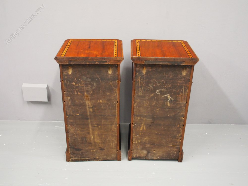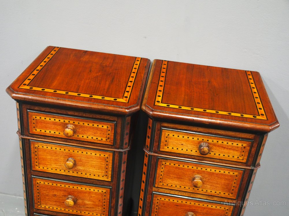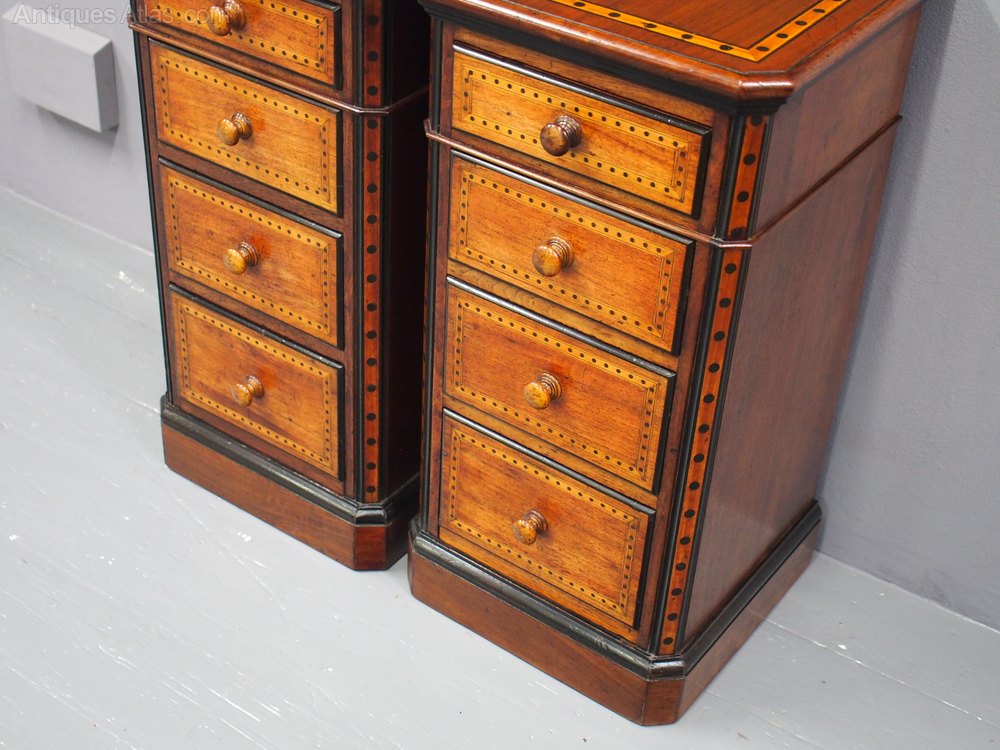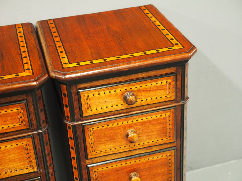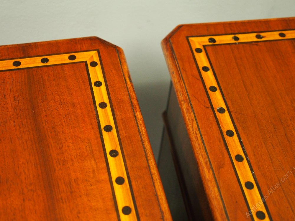 Circa 1890, pair of Arts and Crafts influence mahogany chest of drawers or bedside lockers. The tops with canted corners and moulded edges with satinwood and ebony inlay are over 4 graduated walnut lined drawers with conforming inlaid fronts, ebonised edges and turned wooden knobs. This is all flanked by inlaid canted corners all on moulded plinth bases.