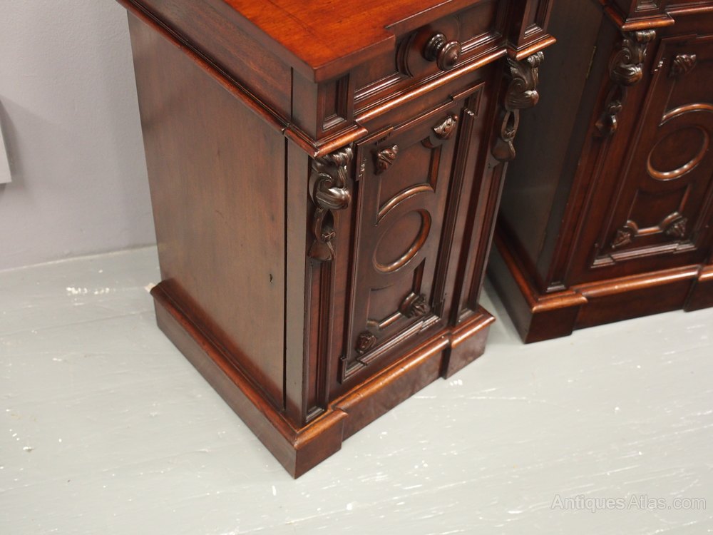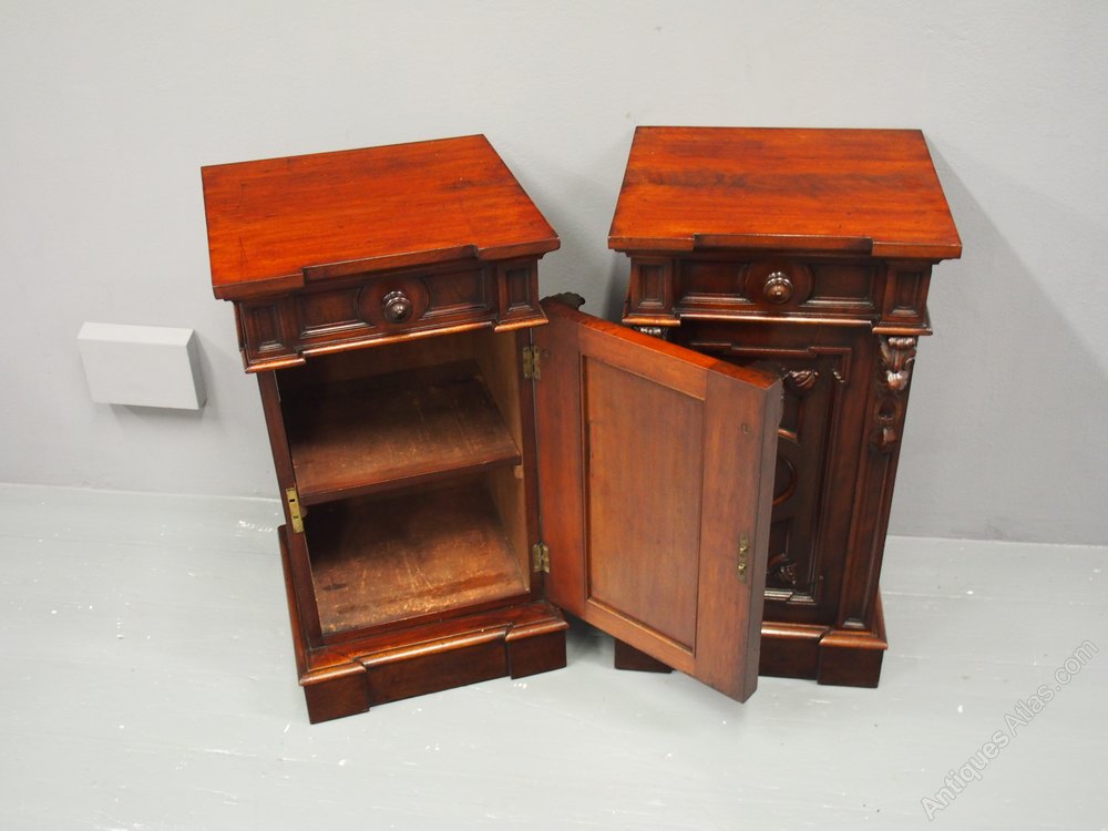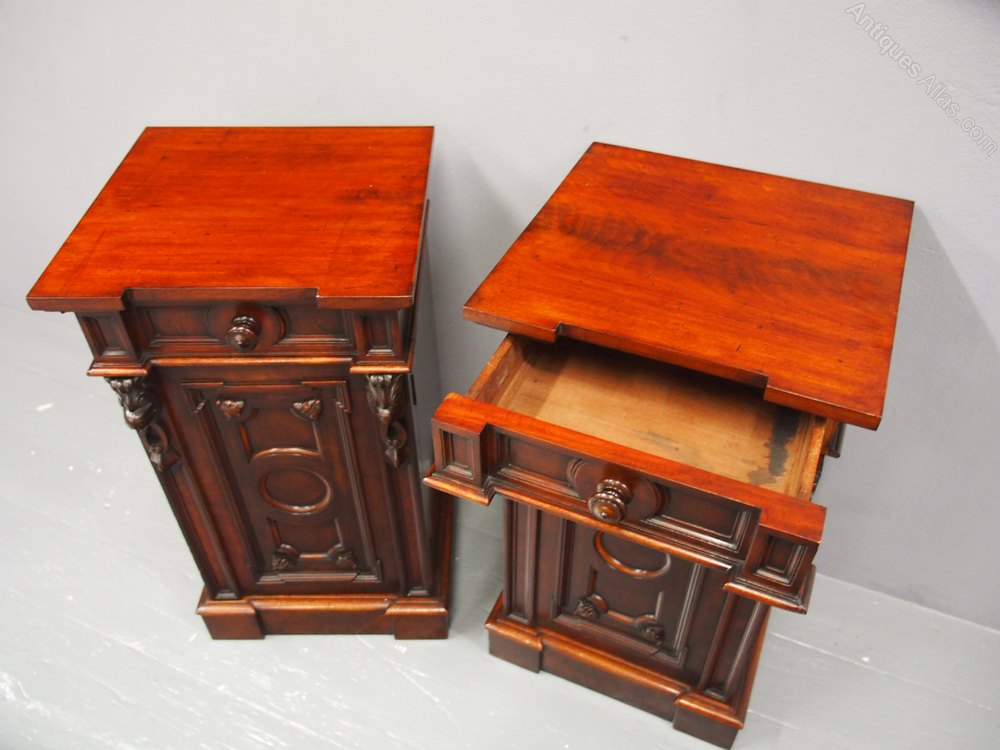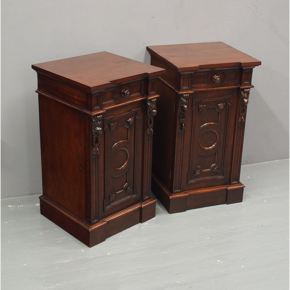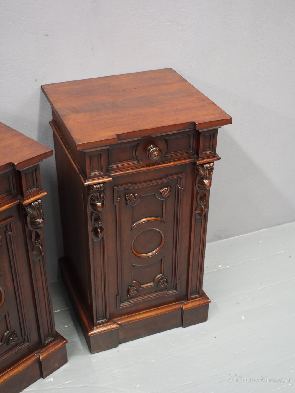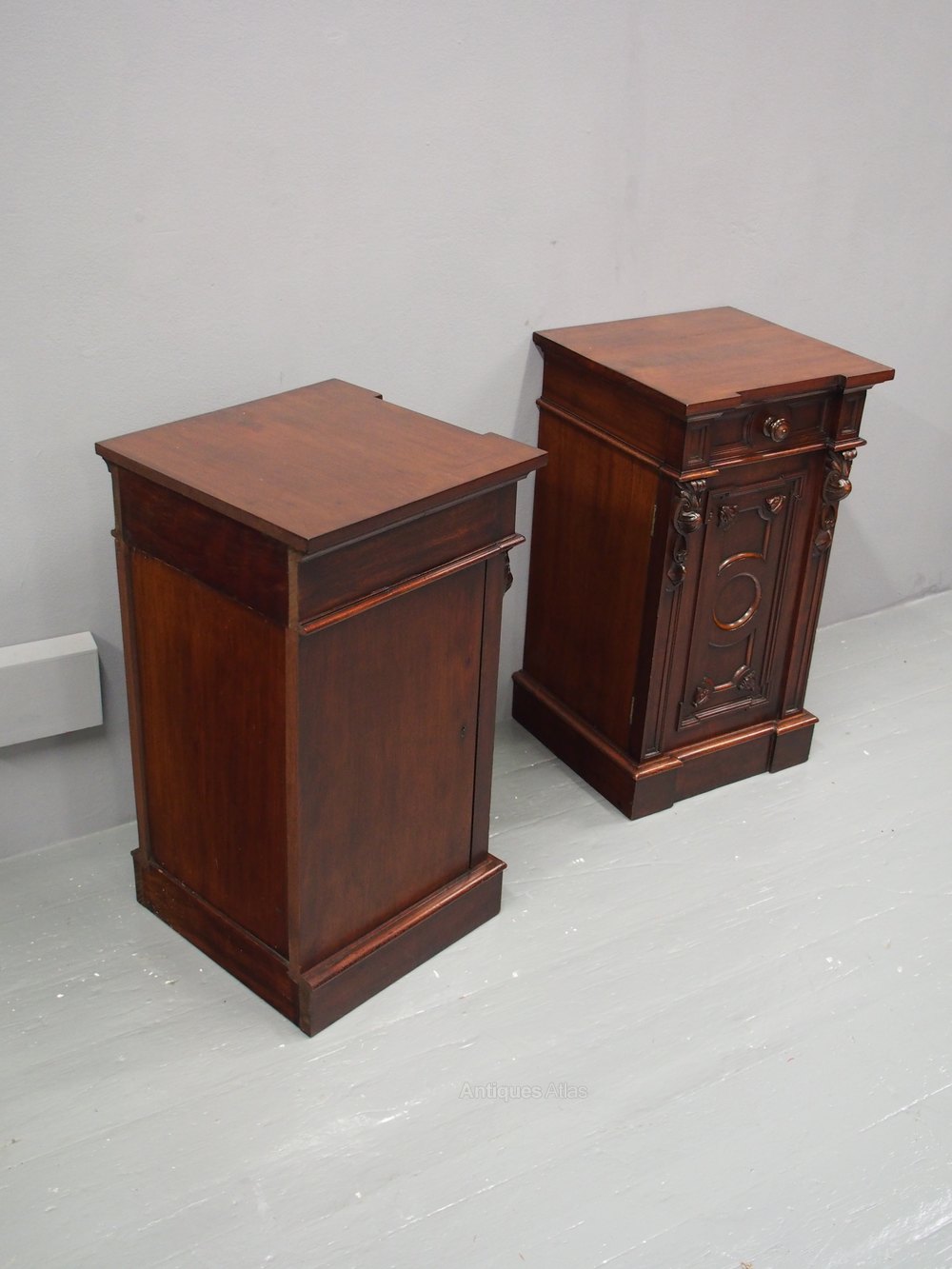 Circa 1880 with adaptations, pair of small chests or bedside lockers in flame Spanish mahogany. The reverse breakfront top with figuring is over a moulded fronted drawer with roundel decoration and central turned knob. This is above moulded panelled doors, flanked by pilasters with foliate carving and opening to a shelved interior. All supported on enclosed plinth bases.
