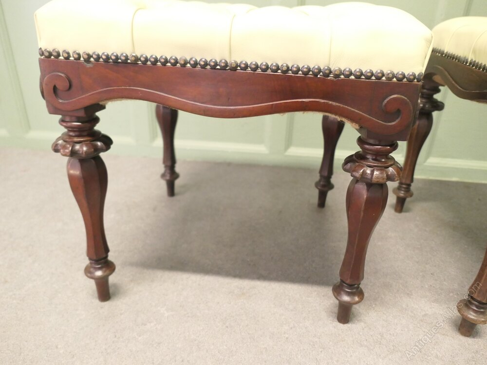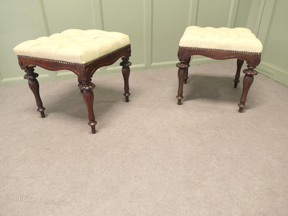 A Lovely pair, these very attractive Victorian stools are made in Walnut, they stand on elegant turned legs with a delightful scalloped shape to the apron The stools have been upholstered in very soft pale cream coloured leather