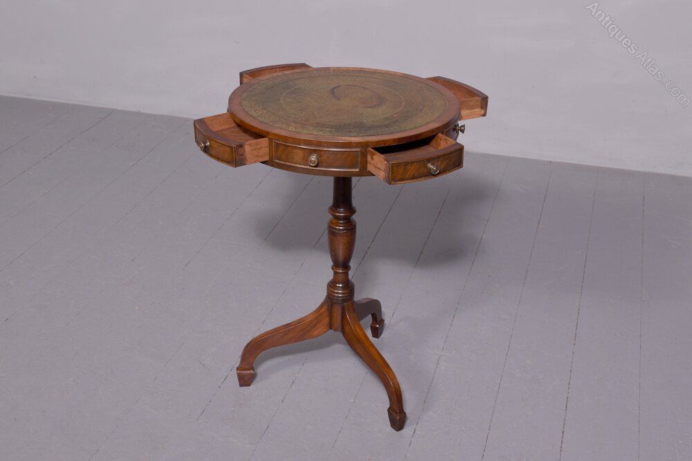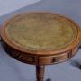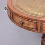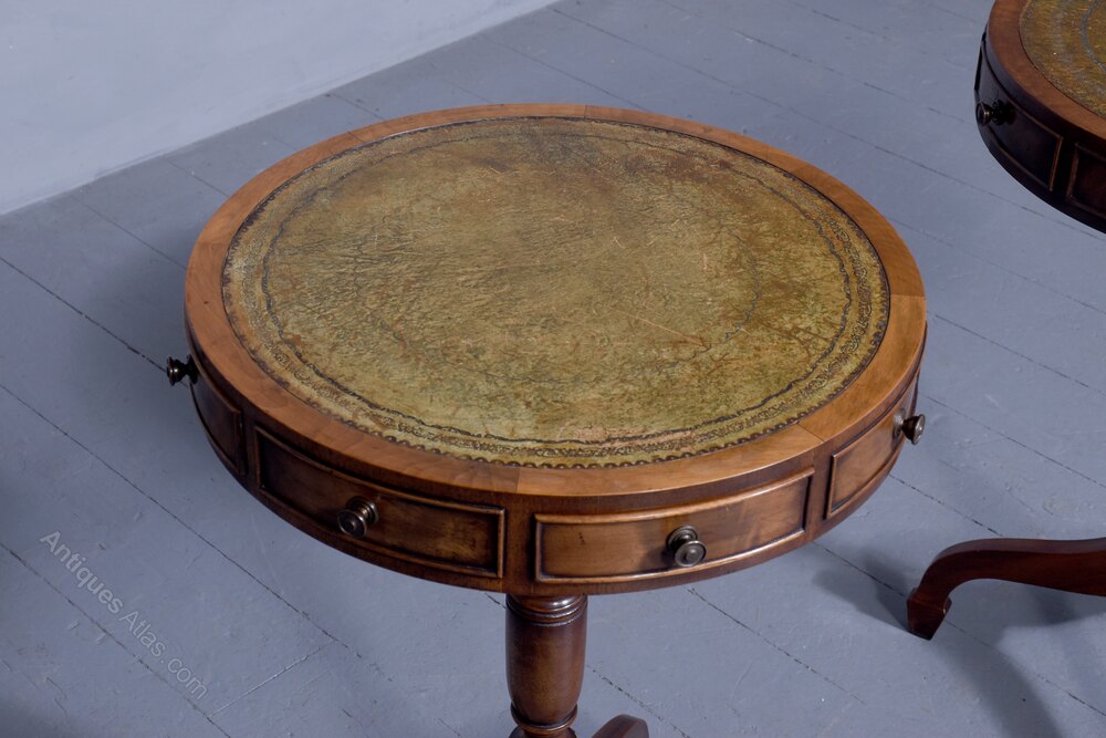 Circa 1930s. A neat sized pair of miniature revolving top drum antique tables, each with a green tooled and gilded leather insert with broad banding, the frieze with of drawers alternation between real and faux drawers, all with fine beadings with cast brass knob handles, resting on a classic turned and tapering stem with urn shape towards the base, issuing three downward facing saber legs finishing on a simple splayed foot