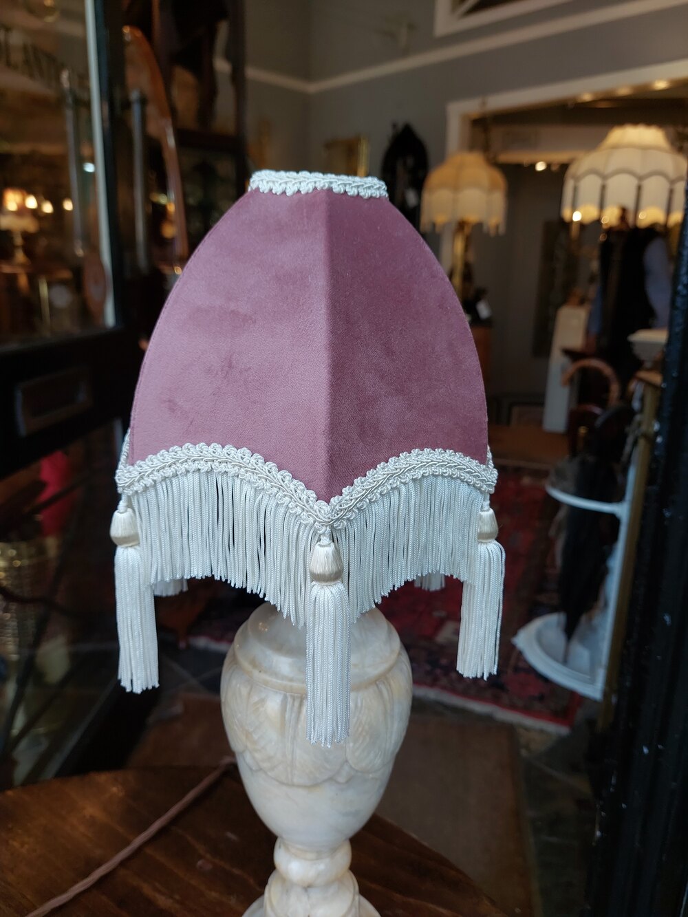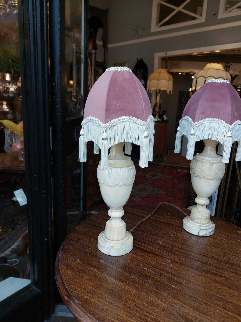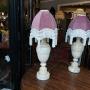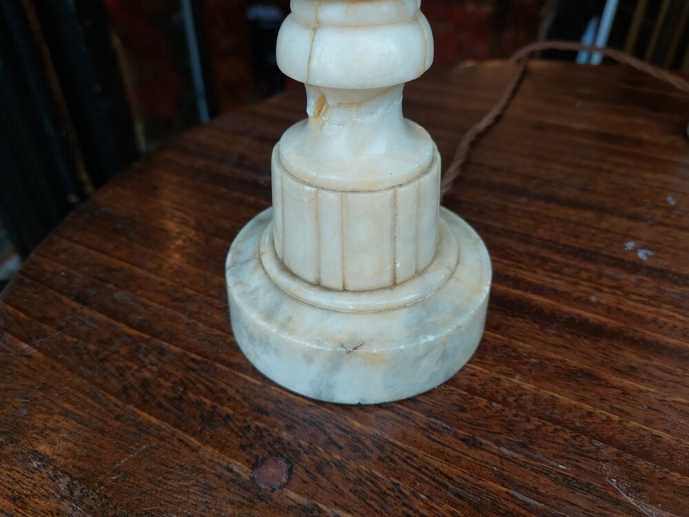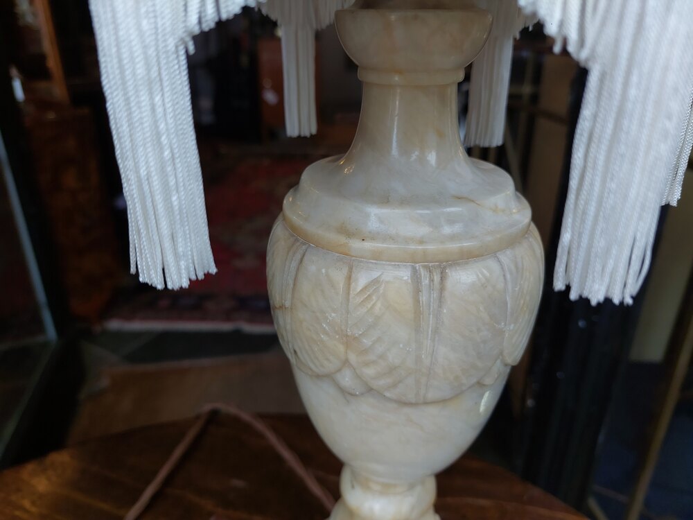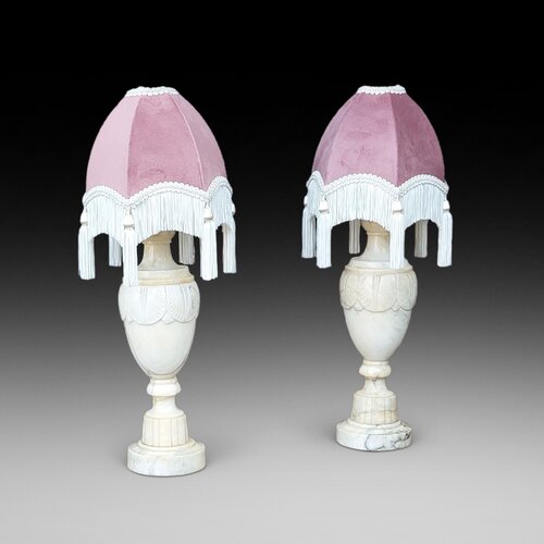 Pair of Early 20thC Marble-Effect Alabaster Table Lamps of baluster form - 7" diam x18"h - The lampshade(s) are newly handmade silks by the same maker as provides the shades for Downton Abbey - all lights and lamps have been rewired with authentic corded flex, fitted with either foot switch or finger clicker switch and are Pat tested