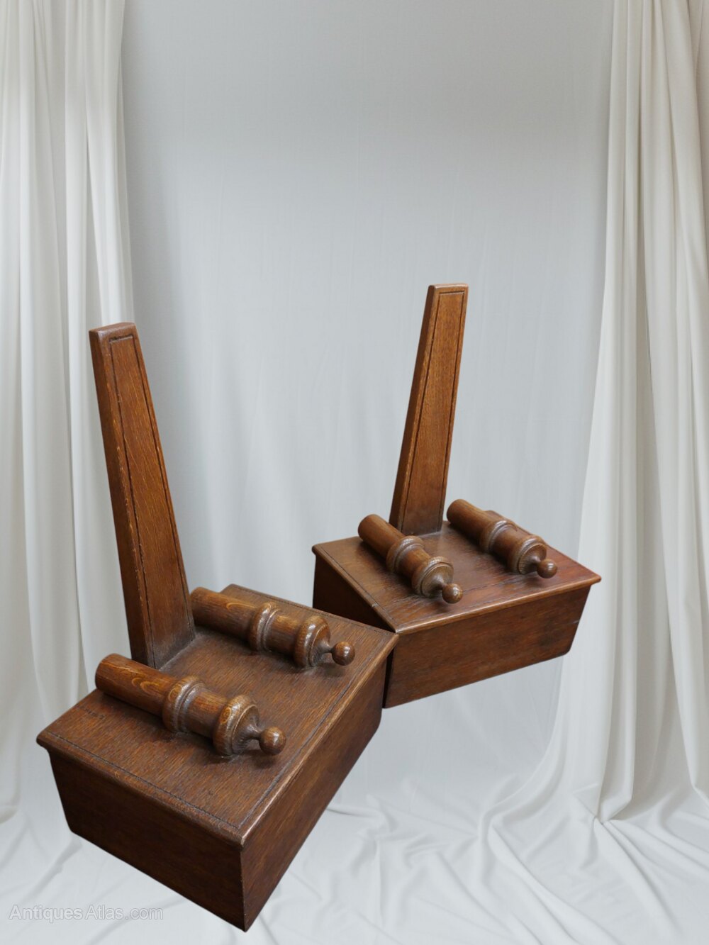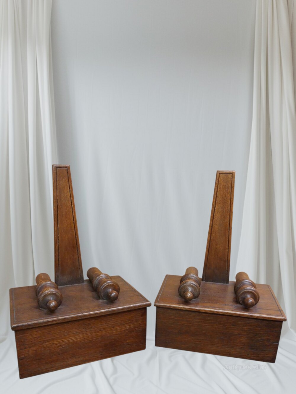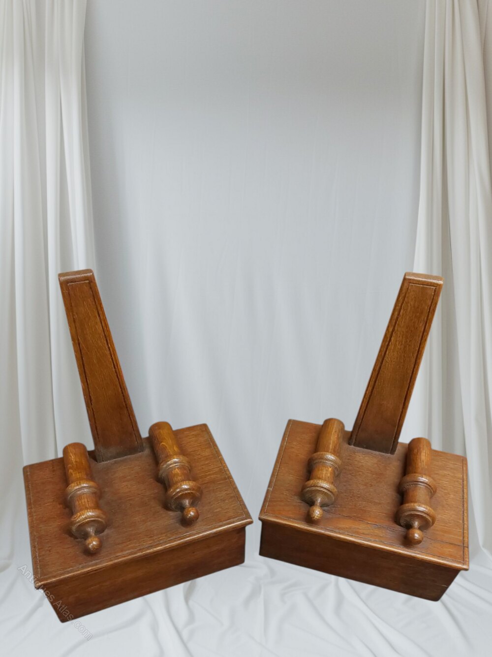 A quality matching pair of Gillows style Edwardian weighted plate/plaque stands. Unusually made in Oak (usually mahogany). In very good original condition. Good size at 10" wide x 7" deep x 14" tall and weighing 5 kilos each. Polished and waxed ready for use. Circa 1910.