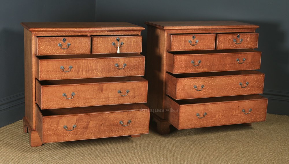 Condition This pair of Georgian style oak chests of drawers are in excellent condition. Nominal old used marks to the leading edges and frame, but nothing significant considering their age. The chests have been cleaned and traditionally French polished by hand to a professional standard in our workshop. Lovely golden oak colour and patination to the timber. The oak drawers feature cock beaded fronts, dovetail construction and the original working lock to the top right drawers, with working key. The steel swan neck handles are original. The drawers close flush to the frame. The chests stand on their original bracket feet and retain the original backboards. This pair of chests is solid in joint and ready to use.