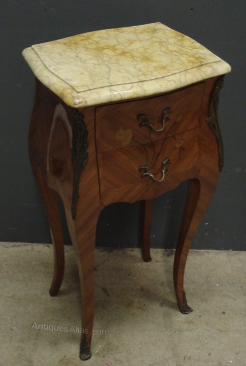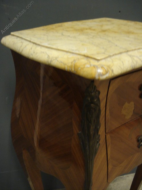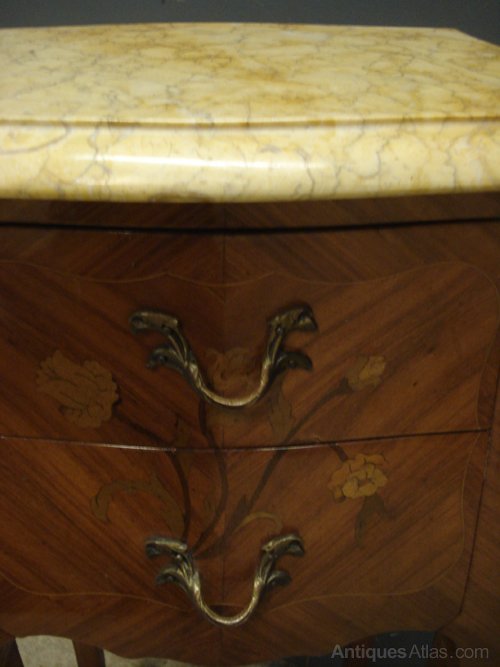 Ref 5644 - Pair of walnut veneered inlaid Louis XV style bedside cabinets with original marble tops and original fittings. Circa 1900.