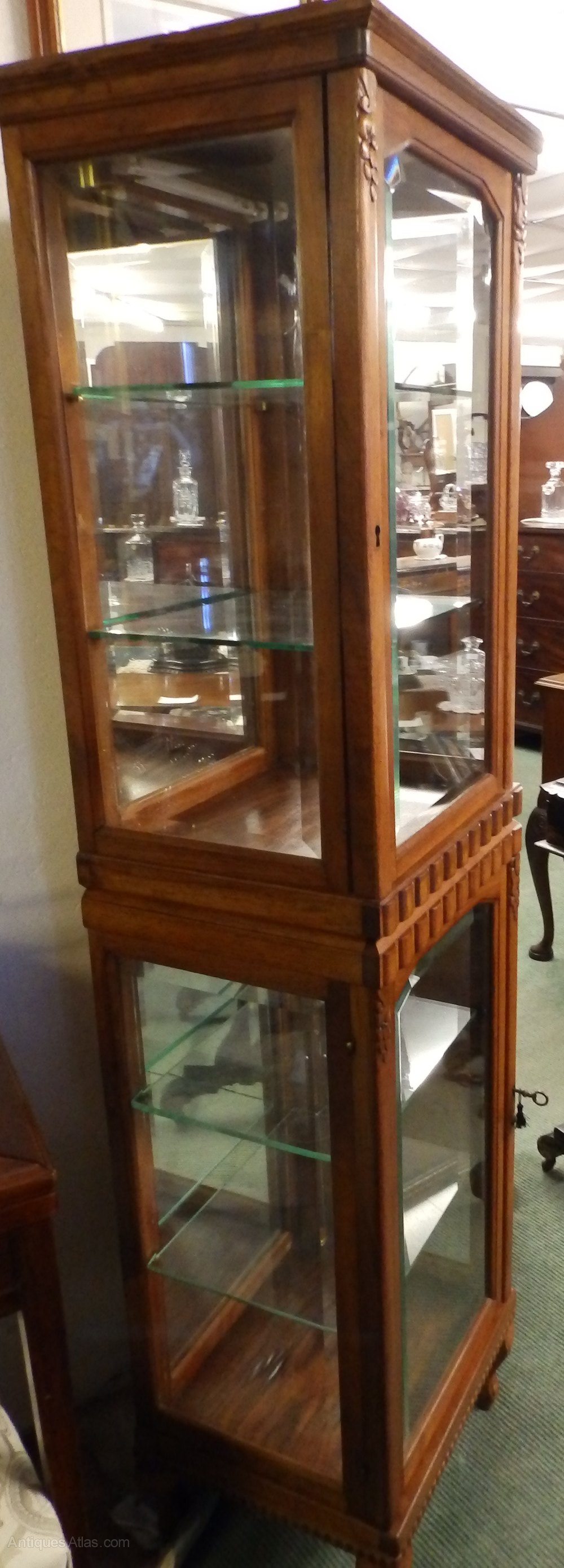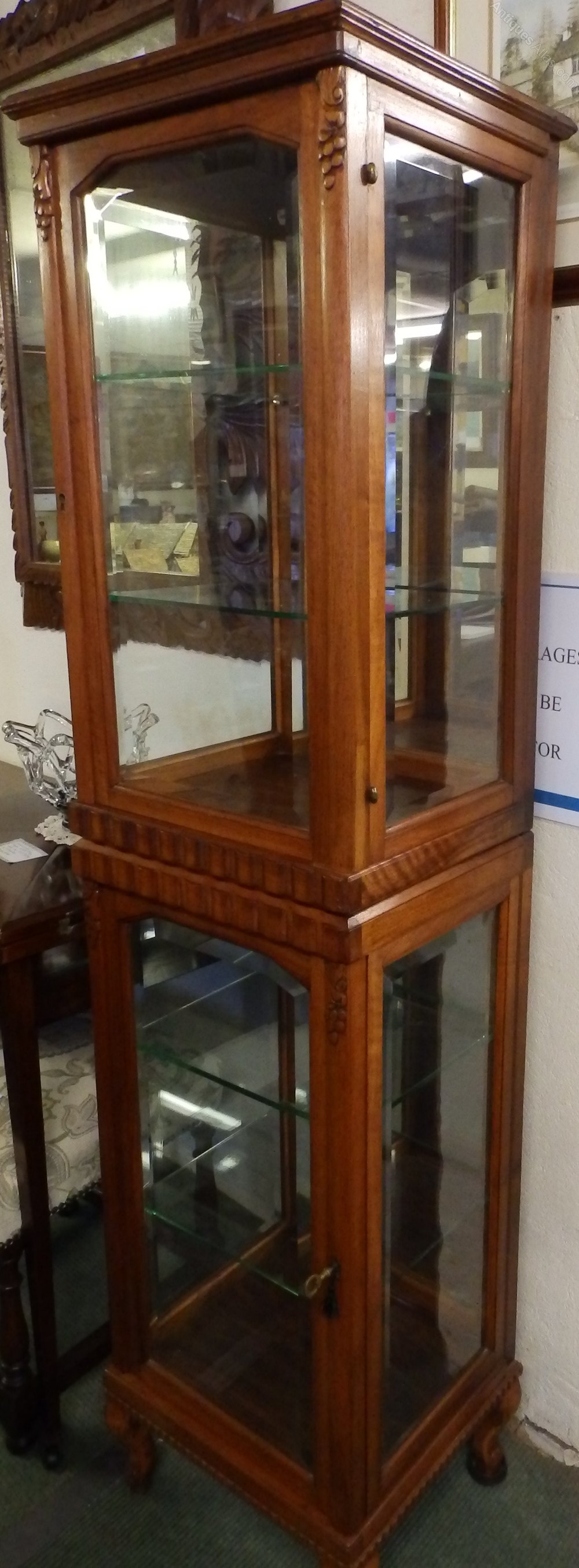 no-71-pr of 1920/30s walnut/fruitwood stacking display cabinets none working locks