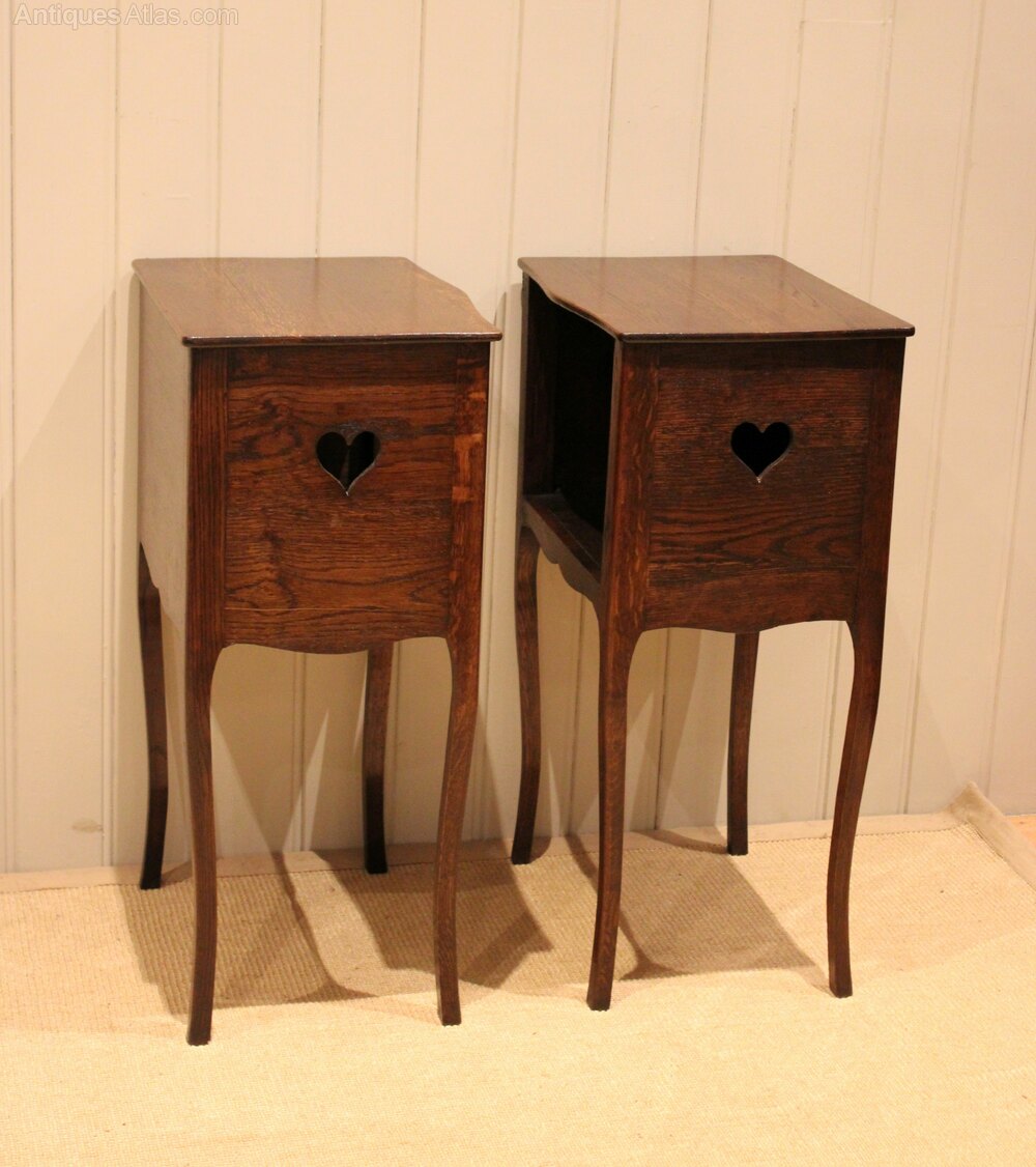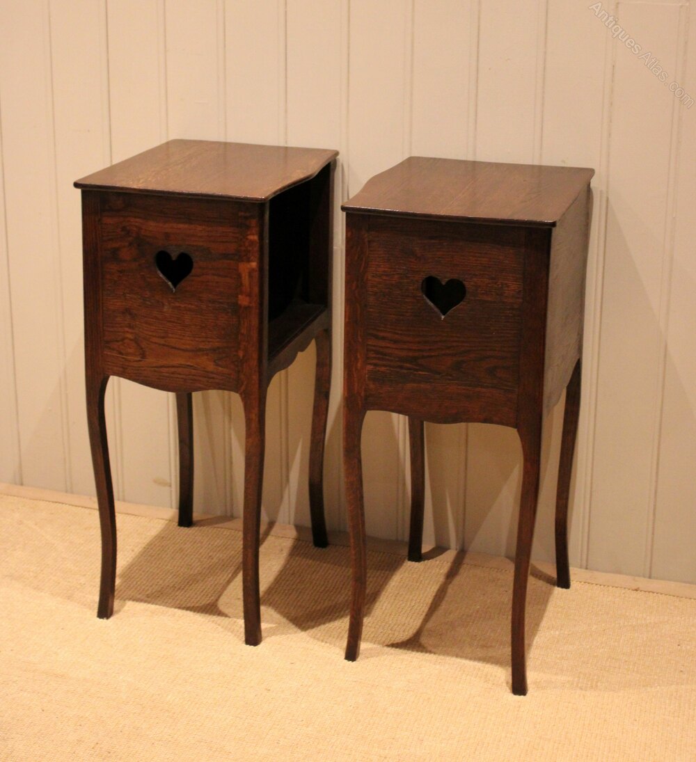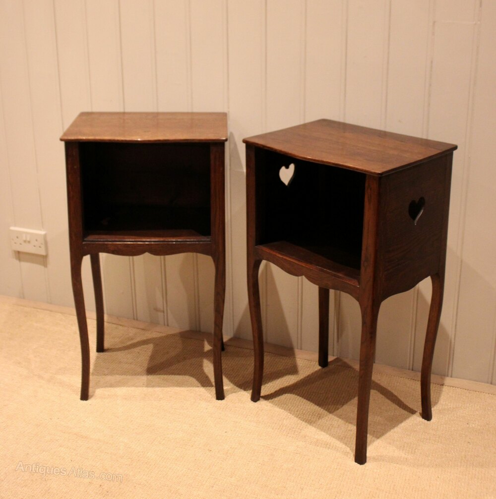 Pair of French oak open cupboard bedside cabinets having a pierced heart decoration to each side raised on curved tapering legs .