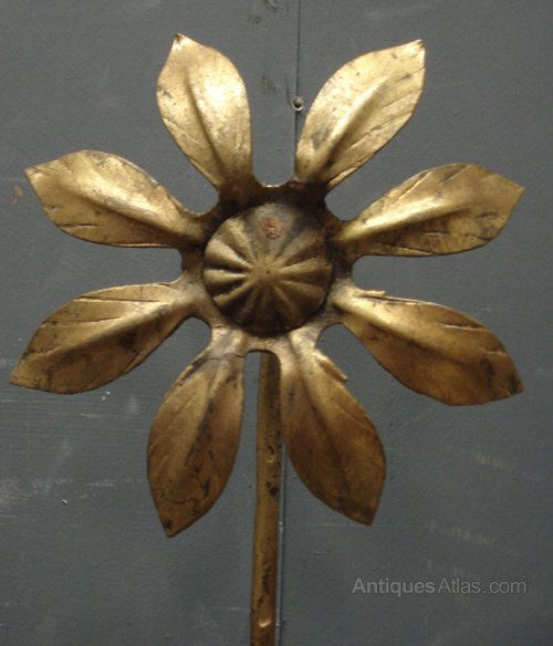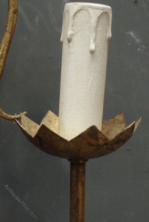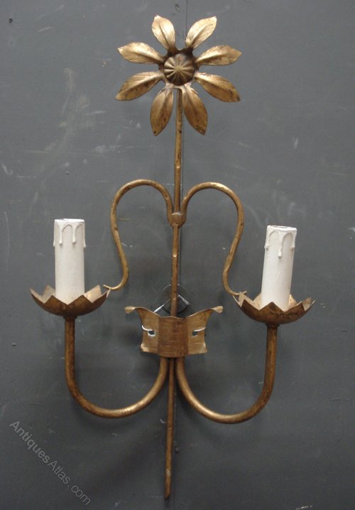 Ref 5670 - Pair of gilt painted metal two arm wall lights. Wiring needs checking. Circa 1950.