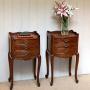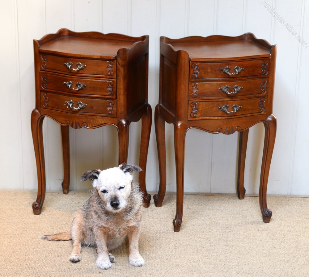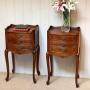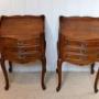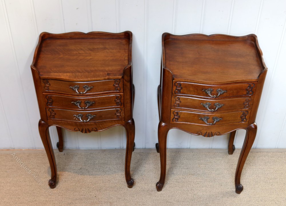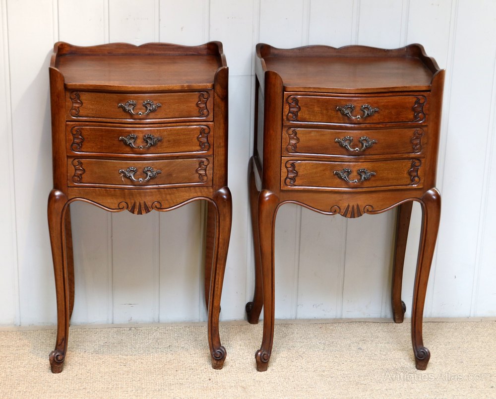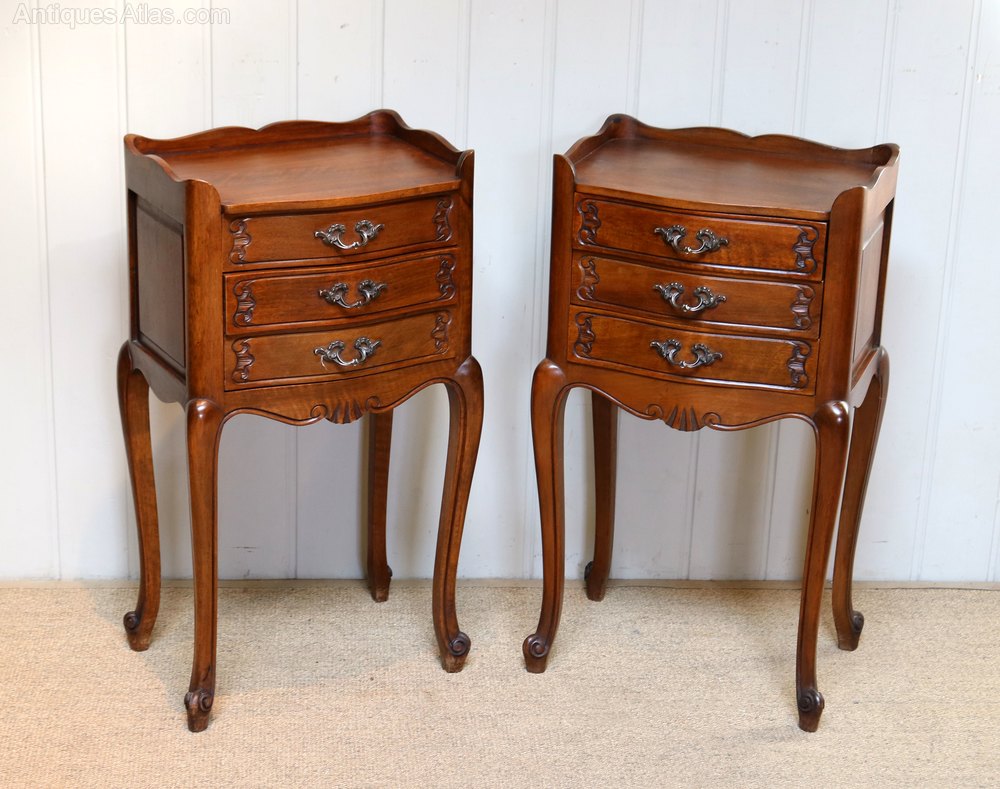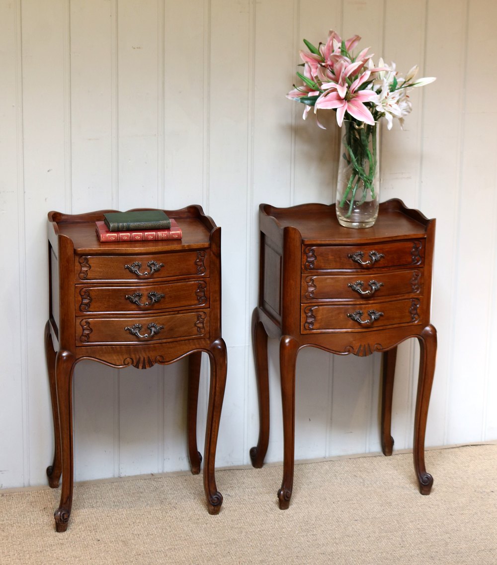 Pair of French walnut bedside cabinets having three drawers with carved detail to the edges and base, panelled sides ,raised on cabriole legs